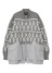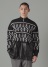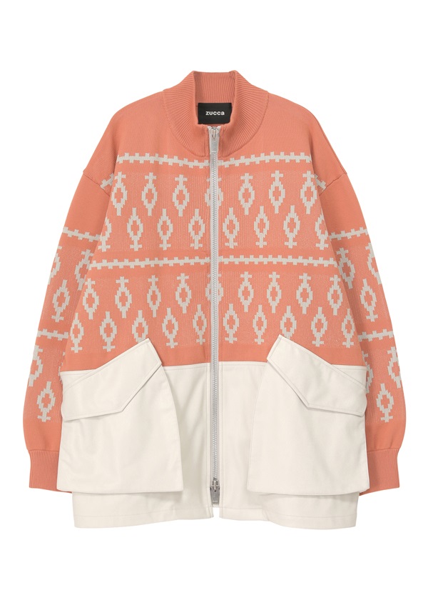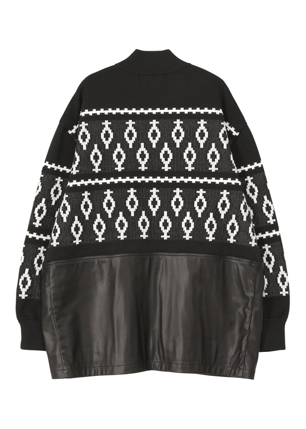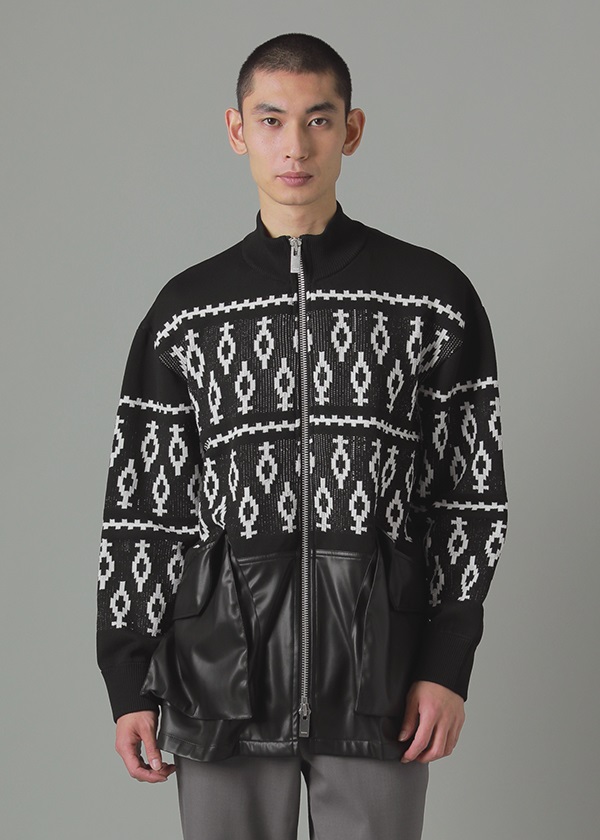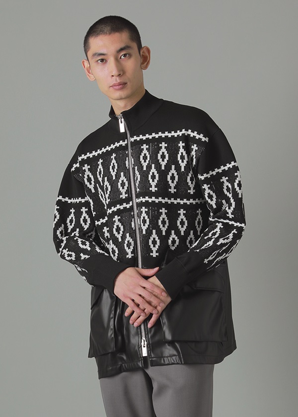 -エスニック調のジャガードニットと光沢ある合成皮革をドッキングしたユニセックスデザインの腰丈ブルゾン。