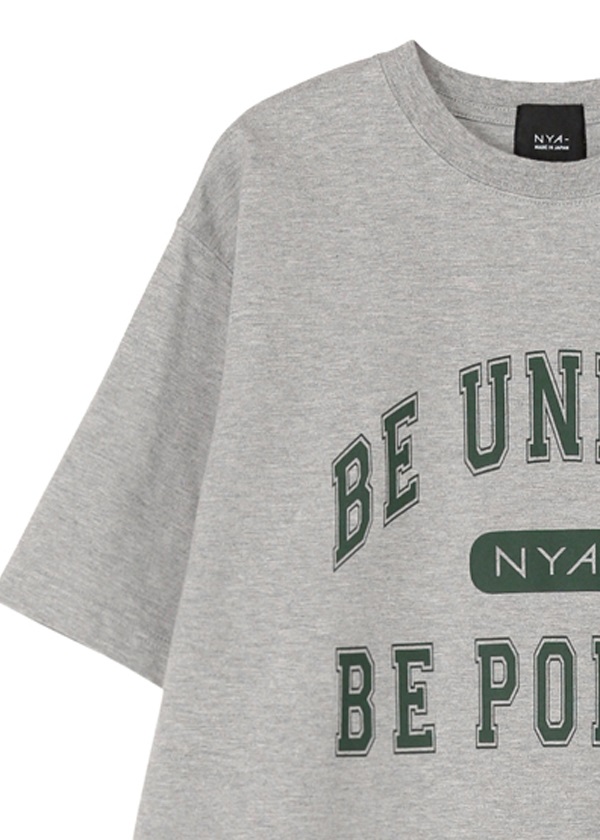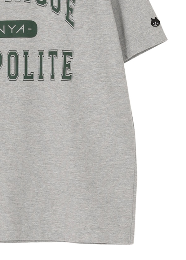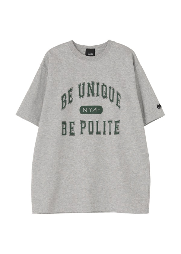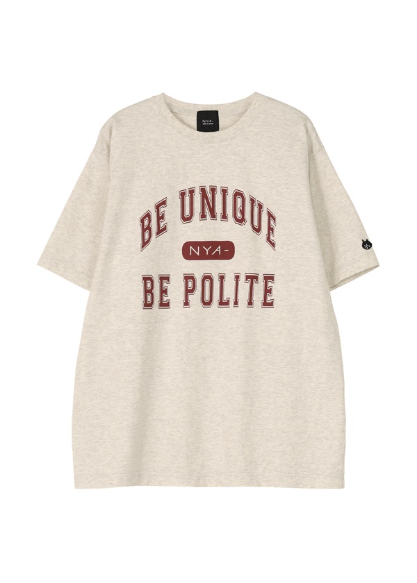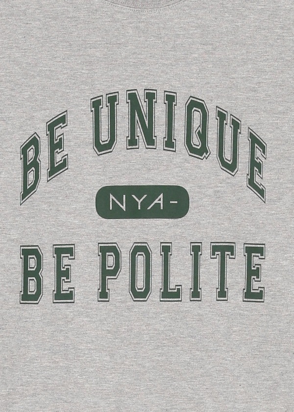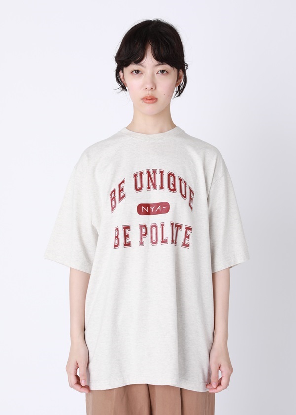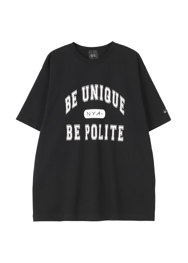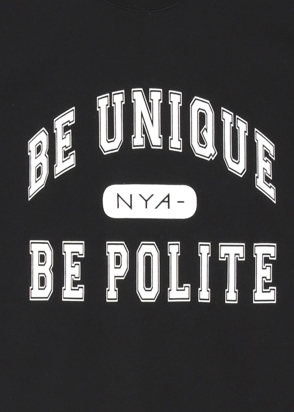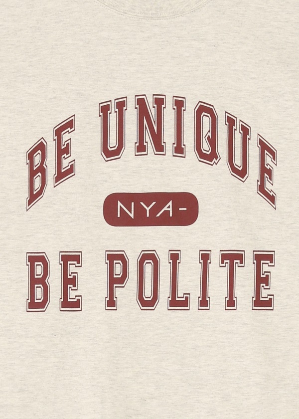 ・ブランドコンセプト「Be unique, be polite」をカレッジTシャツ風デザインにアレンジしたプリントTシャツ。