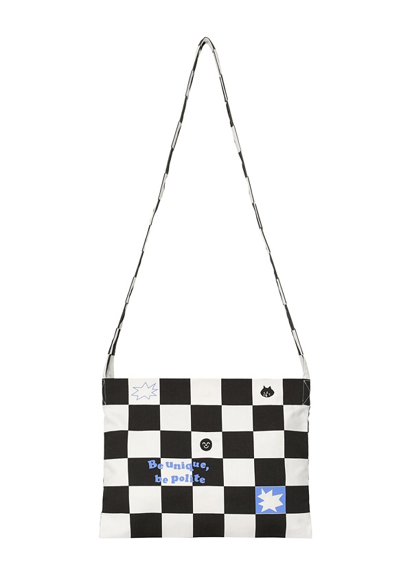 ・チェックの柄に合わせるようにデザインしたプリントの配置や、ショルダー部分までチェック柄が綺麗に出るよう、細部までこだわりました。・内側ポケットが1つついています。・NYA-の刺繍と愛美さんのアイコン「スマイル」を刺繍し、ユニークでスペシャルなデザインです。