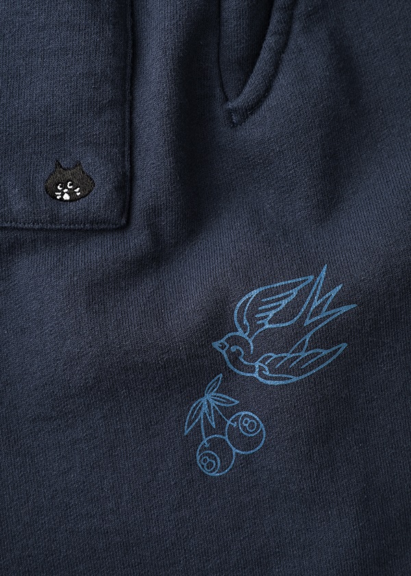 ・ぱっと目を惹く、パンサーに扮した「KENDAI風NYA-」のプリントも、サイドにハギがないデザインだからこそプリントすることができています。・左ポケットにKENDAIオリジナルグラフィック、そしてバックスタイルには今回の為に描きおろしたスワンのグラフィックをプリントしました。