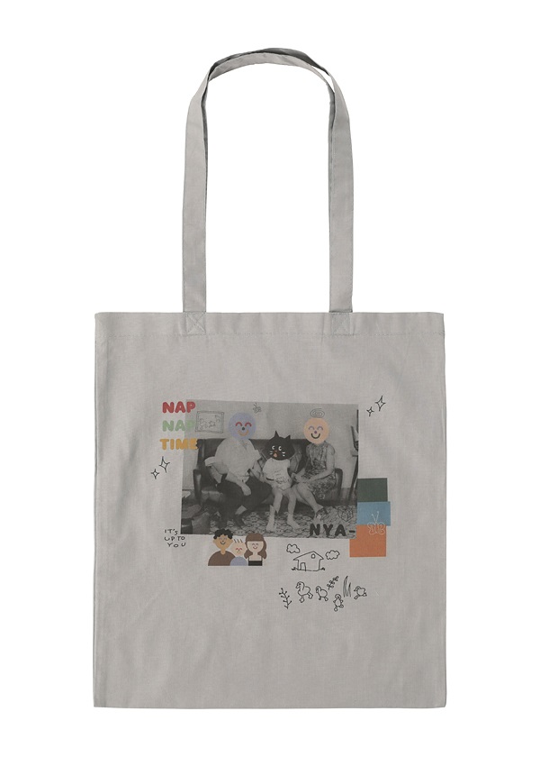 ・家族写真をベースに、愛美さんらしくコラージュしたグラフィックをトートバッグにプリントしました。