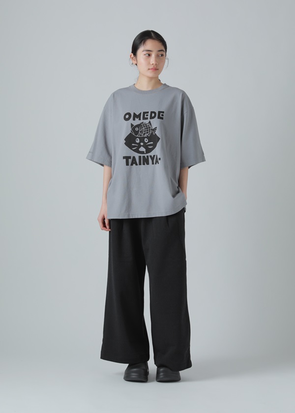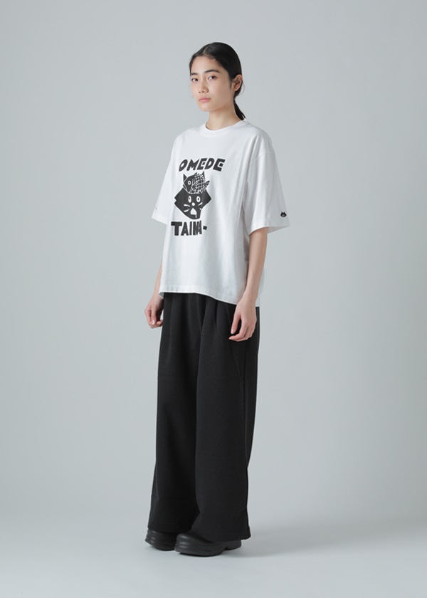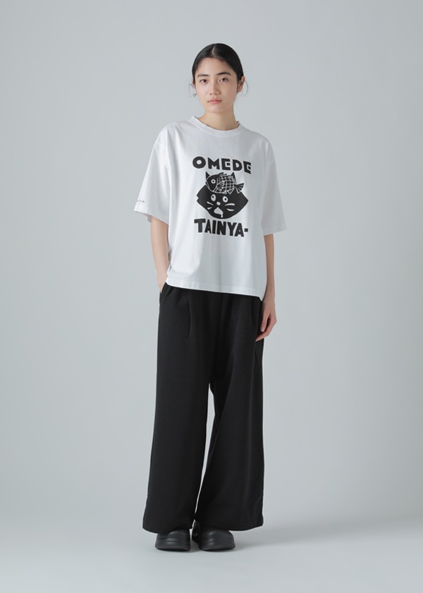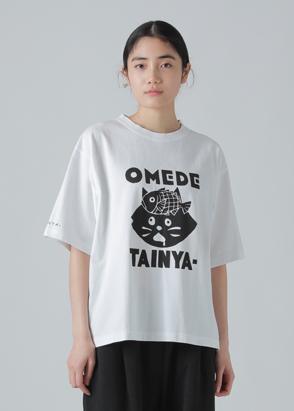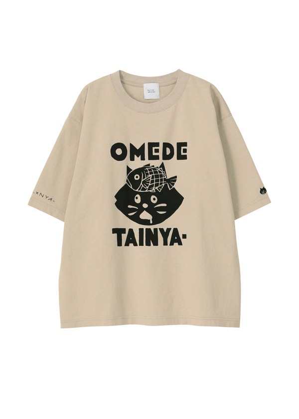 ・歴史のある「筒描き」という技法で描かれた" OMEDETAI NYA- "がプリントされたTシャツ。