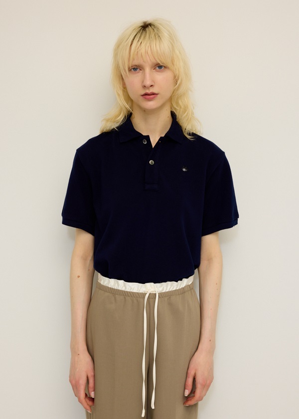 ・NYA-の刺繍がユニークな位置に施されたユニセックスポロシャツ。