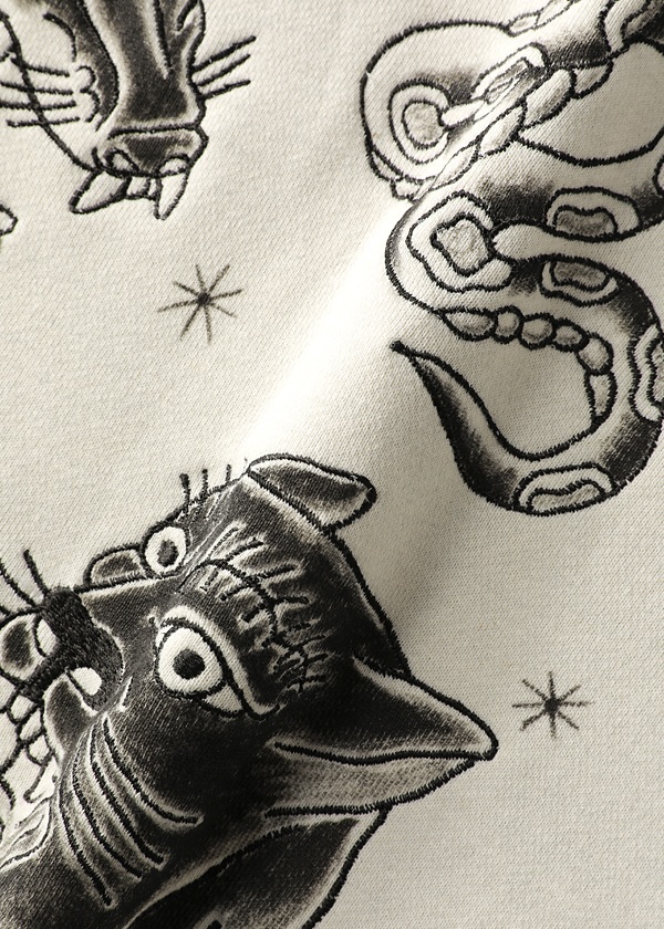 ・NYA-の定番のスウェットトップスにKENDAI描きおろしのグラフィックを刺繍やハンドペイントで表現。