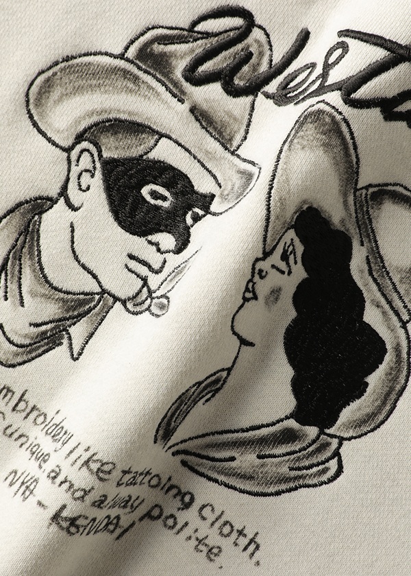 ・NYA-の定番のスウェットトップスにKENDAI描きおろしのグラフィックを刺繍やハンドペイントで表現。