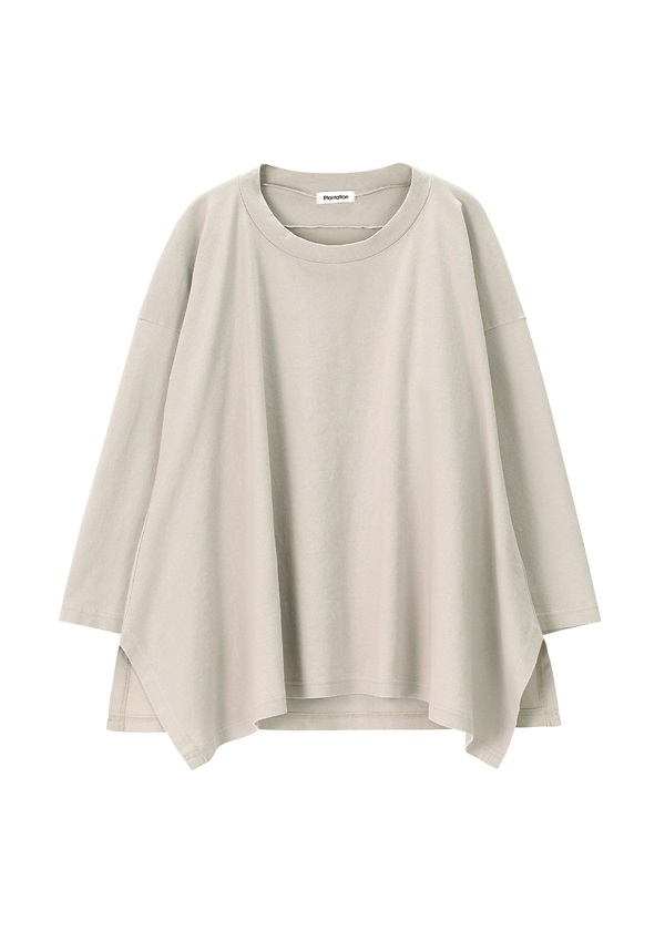 30/1の紙糸と綿の60/1を撚糸した20/1の糸で編み上げた天竺素材です。肌離れが良くドライ感があり着心地の良い生地になっています。ジャージ素材ですが、裾にかけてドレープが美しいシルエットに仕上がっています。ラフすぎず、普段使いにも取り入れやすいアイテムです。