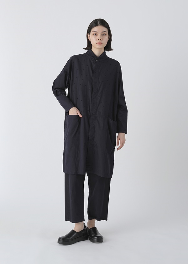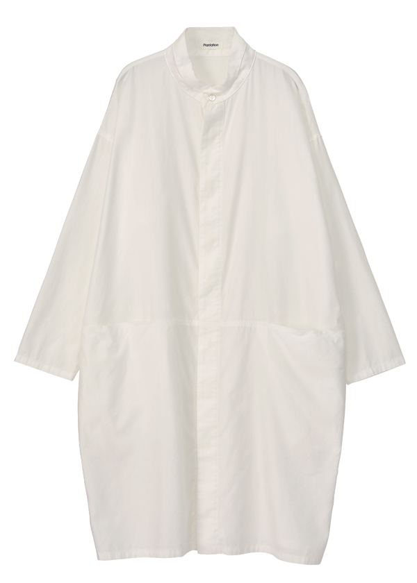 Plantationならではの小さめ襟のスタンドカラーチュニック丈シャツ。カジュアルにもきちんとスタイルにも活躍するアイテムです。ボタンを開けて羽織りとして着るのもおすすめ。肩の落ちたゆったりとしたシルエットで、ストレスなくリラックスして着ていただけます。切り替えを活かしたポケットがあるのもうれしいポイントです。