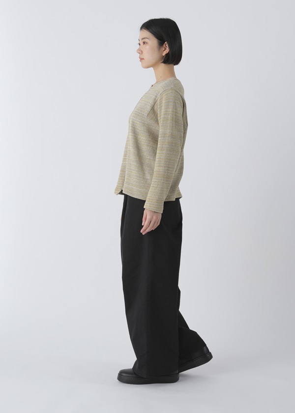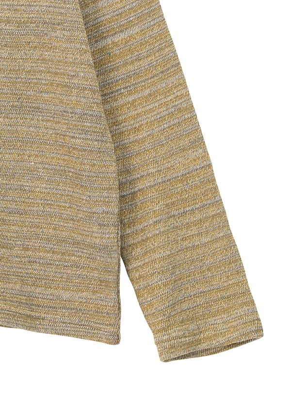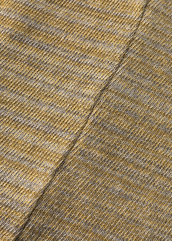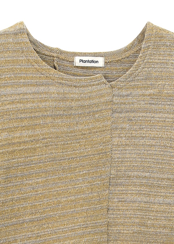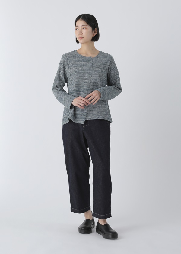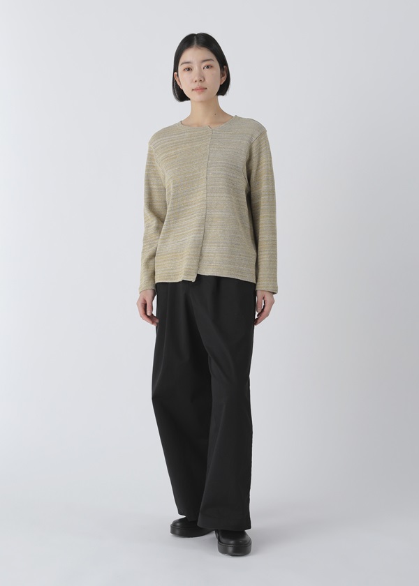ナチュラルなムラのある中空糸を3色引き揃えて天竺を編んでいます。カラーがミックスされナチュラルなカスリ調が表現された生地感が魅力です。軽さを出すために空気を含んだ中空糸を使用し7Gの甘編みにすることでニットライクな仕上がりになりました。