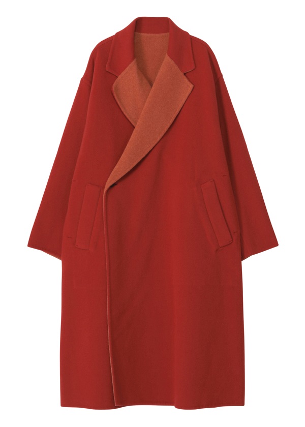 表にニュージーランド産のキーウィラム・裏にオーストラリア産のタスマニアラムを使用しマットな二重織に織り上げたリバー仕立てのコートです。質の良い素材にビーバー加工を施すことで、上品な光沢を持つやさしい肌触りの「上質でありながらリラックス感のある素材」に仕上がりました。無地の表地はマットでシックな仕様に、裏はパネル状にツートーンのボーダーを配しモダンに。リバーシブルで着こなしを楽しめるコートです。