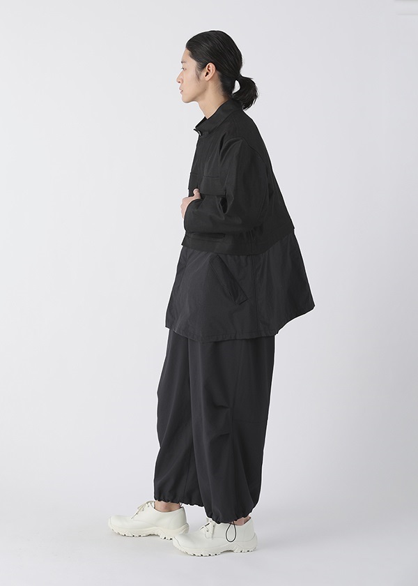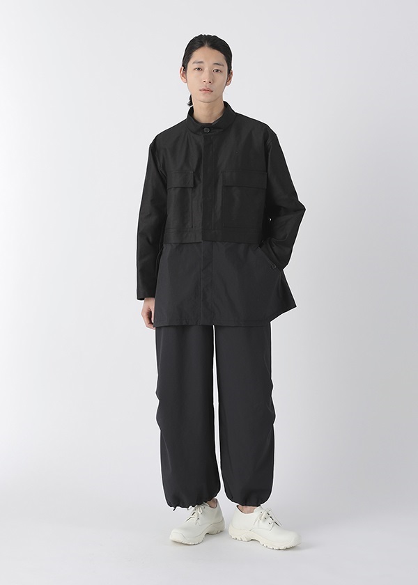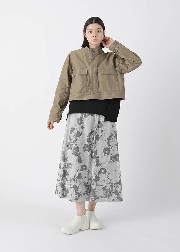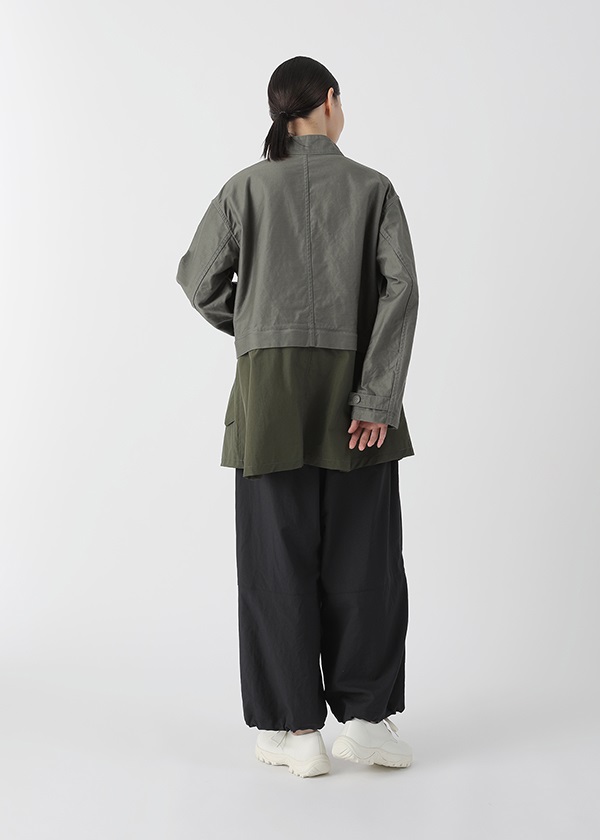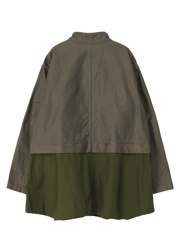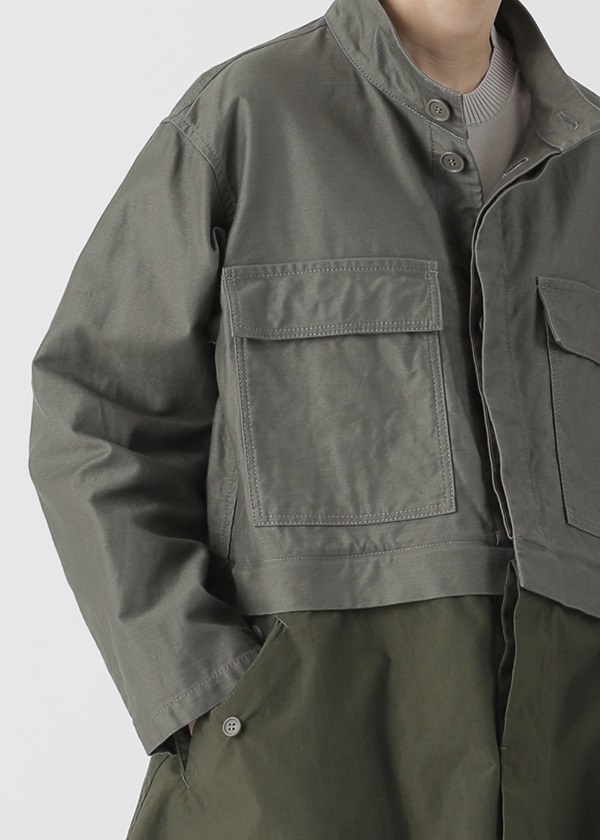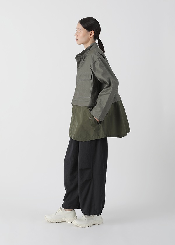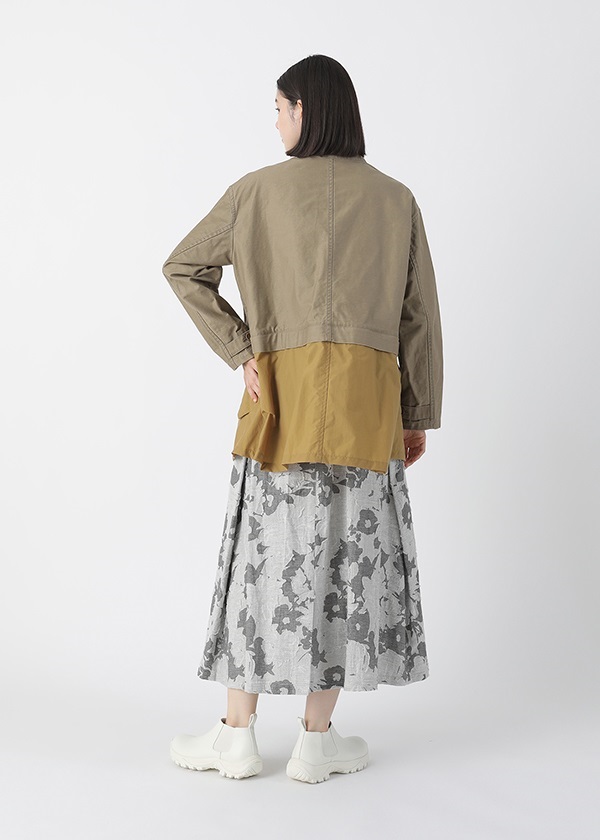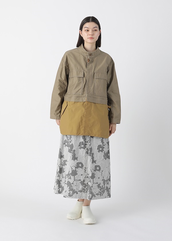 ヨコ糸にムラ糸を打ち込んだコットン100%のバックサテンと軽やかなナイロンタフタを組み合わせたコートです。タフタ部分を取り外すとショート丈のブルゾンとしても着用出来る、2WAYアウターです。着こなしに合わせて、表情を変えて着まわしていただける一着です。