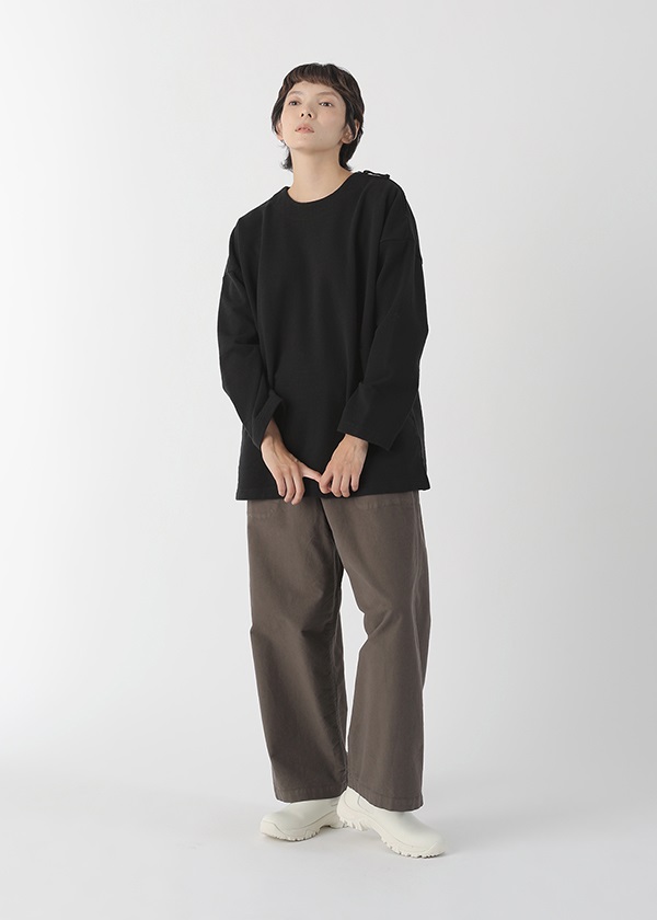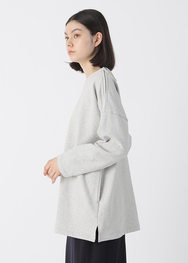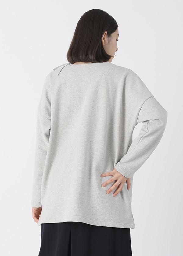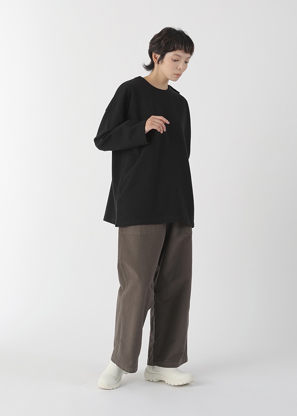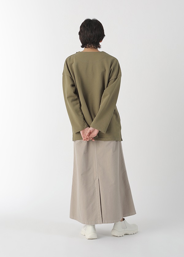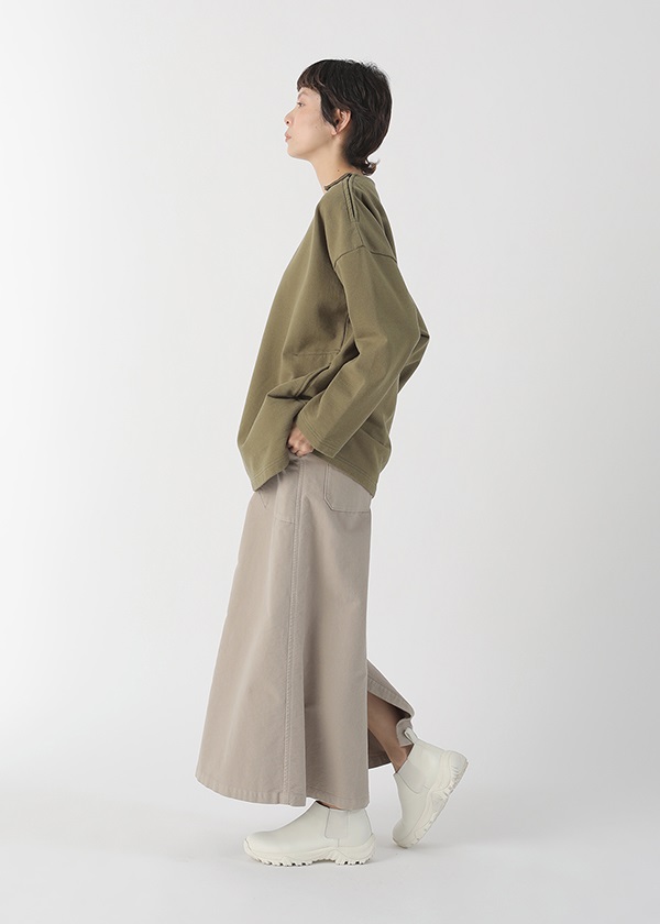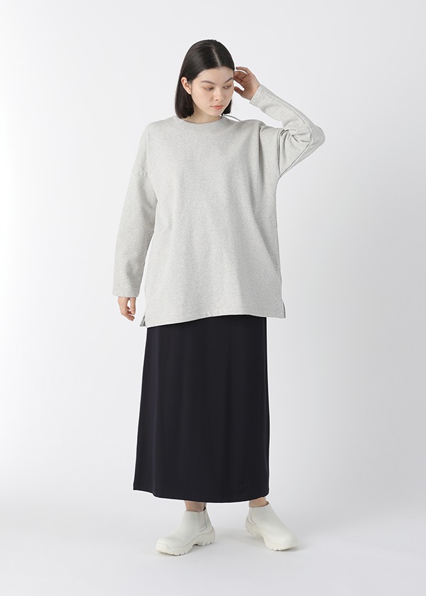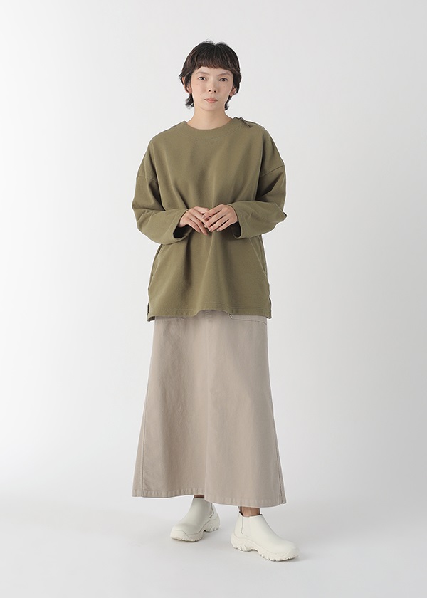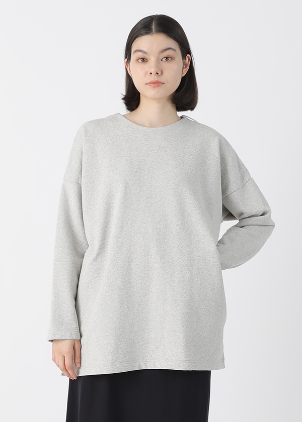 表糸に軽くてハリコシの出る空紡糸を使用しています。裏糸は先染することで両面のインパクトを出しました。しっかりと編地を詰めて編むことで、カジュアルに着こなせる裏毛素材でありながら洗濯後も型崩れしにくいのも嬉しいポイントです。