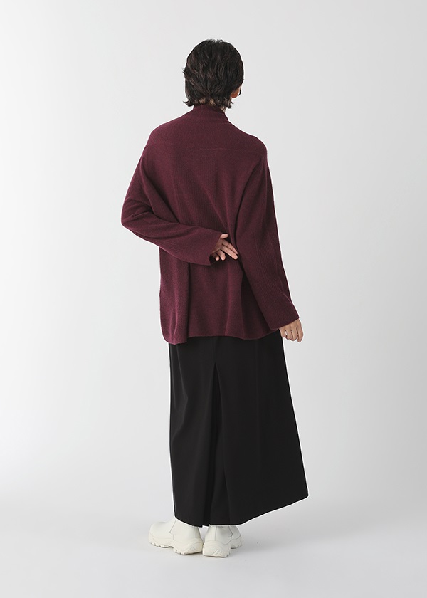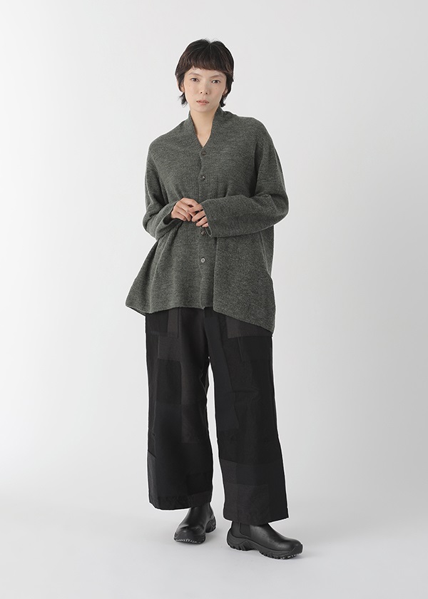 ソフトで膨らみがあるファインメリノウールを撚糸、起毛加工し、ホールガーメントで編み上げています。パッチワーク状に地柄を入れる事により編地に表情がうまれました。非常に軽く肌触りが良いので、デイリーに使えて着回しもきき、快適に過ごせるニットです。