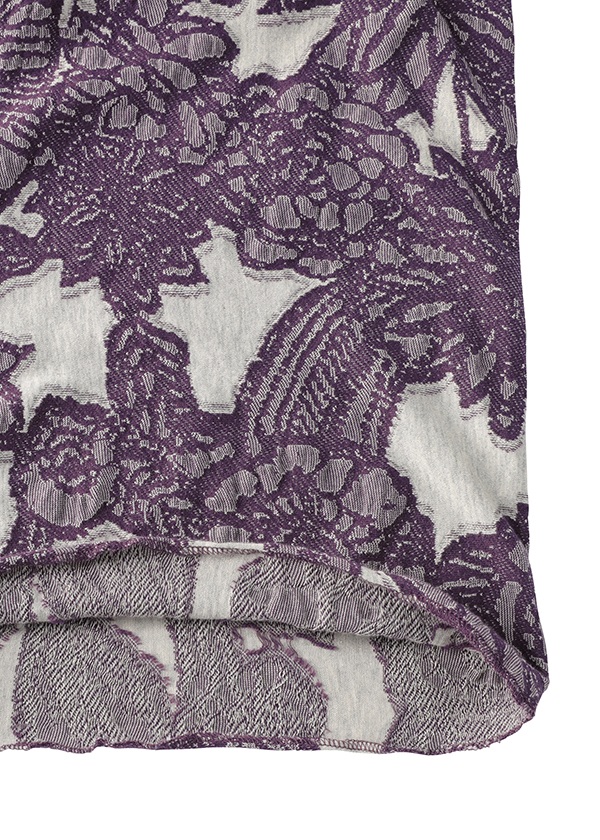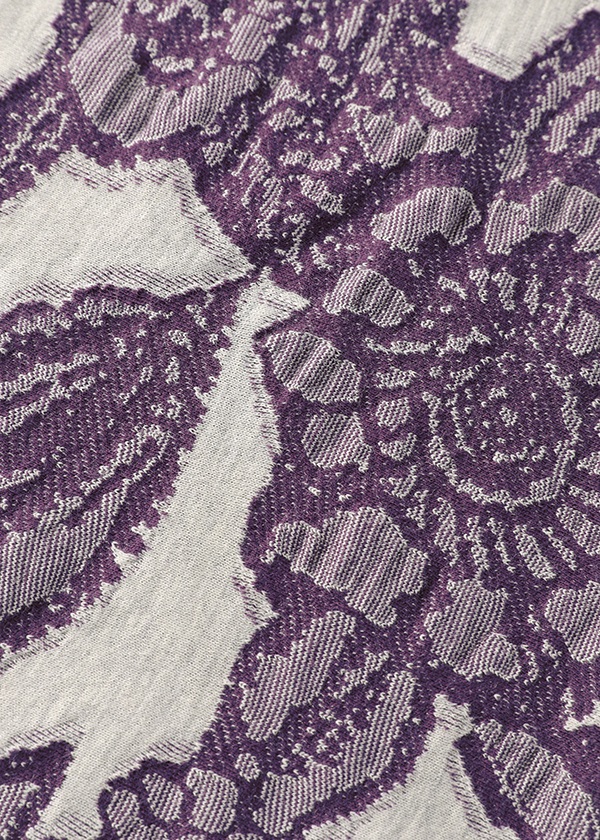 ドットと花柄を組み合わせ、太さの異なる糸を用いてインターシャ機で編み仕上げました。部分的に密度を詰めることで程よい凸凹を生みだし、肌当たり軽やかな着心地の良い素材に仕上げています。