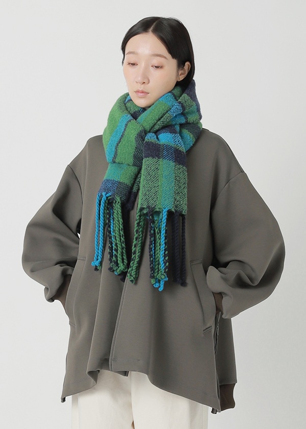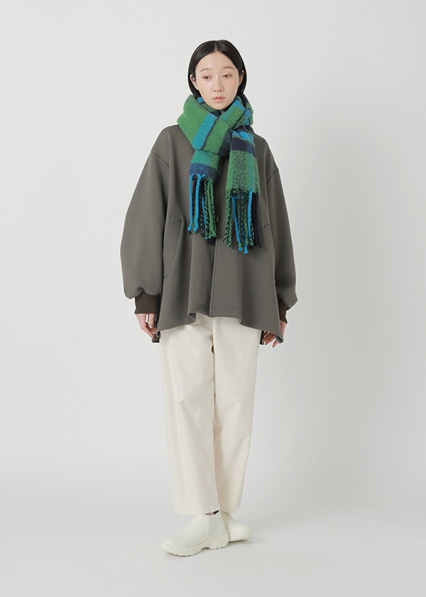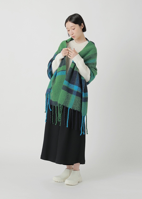 軽く、膨らみのあるファインメリノラムをベースにジャガード状に複雑に編み込んだ糸をカットし、フリンジを表現しました。高品質な素材を使用しているため、柔らかく、滑らかな風合いを感じられます。