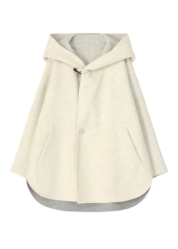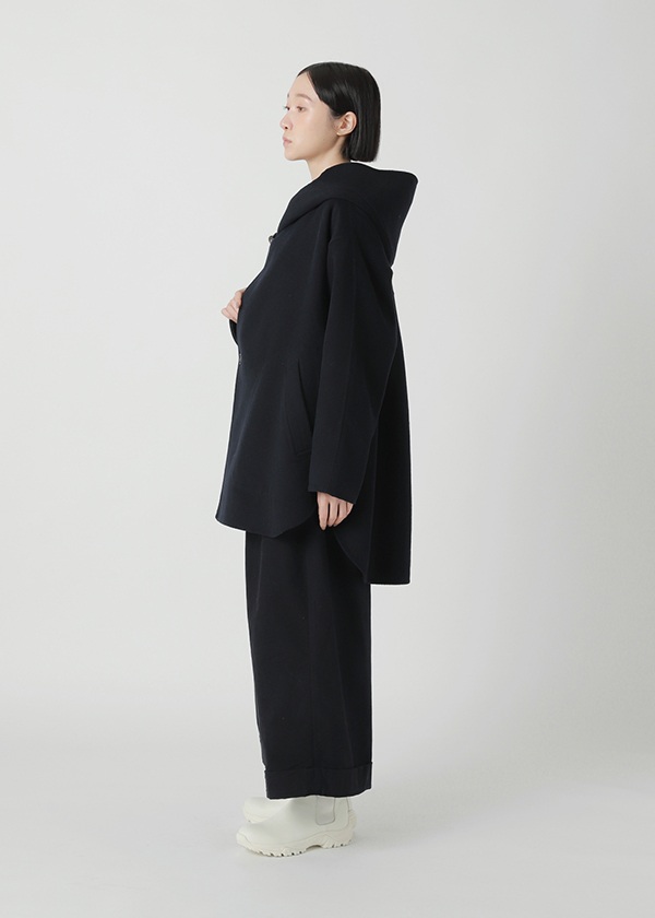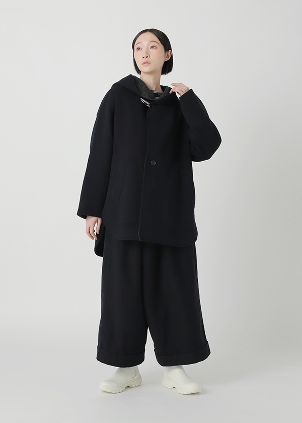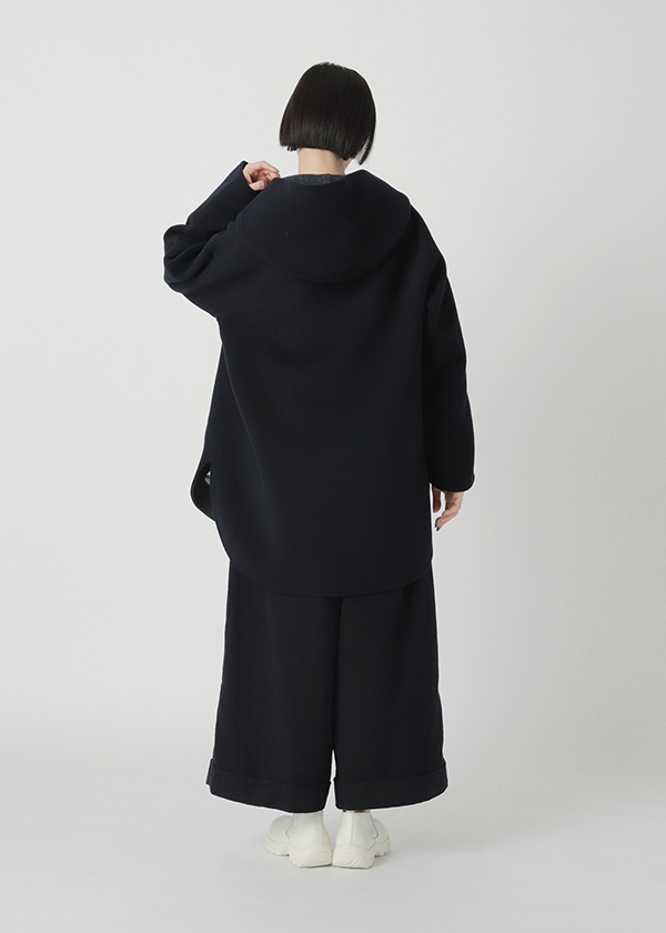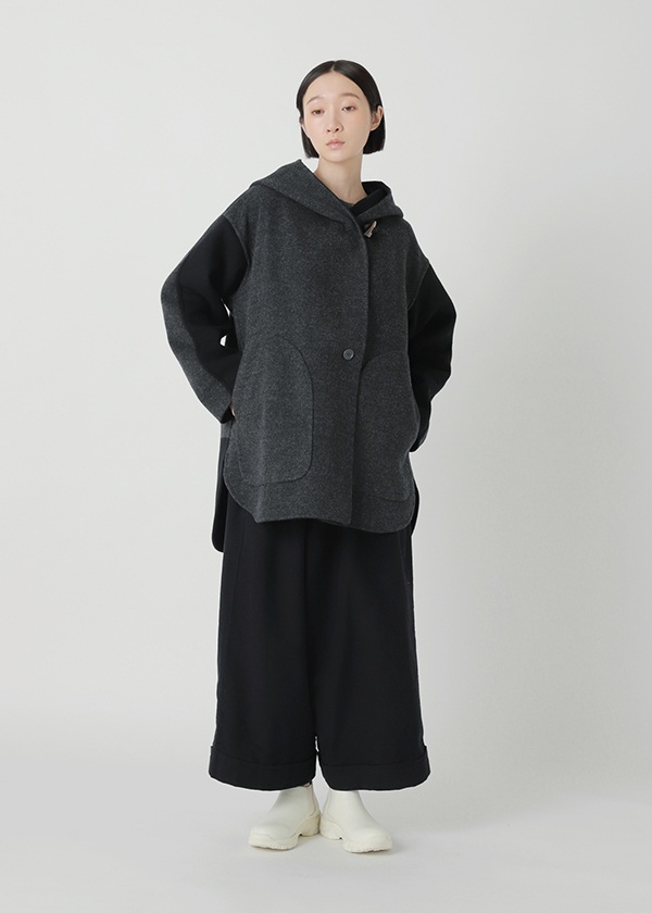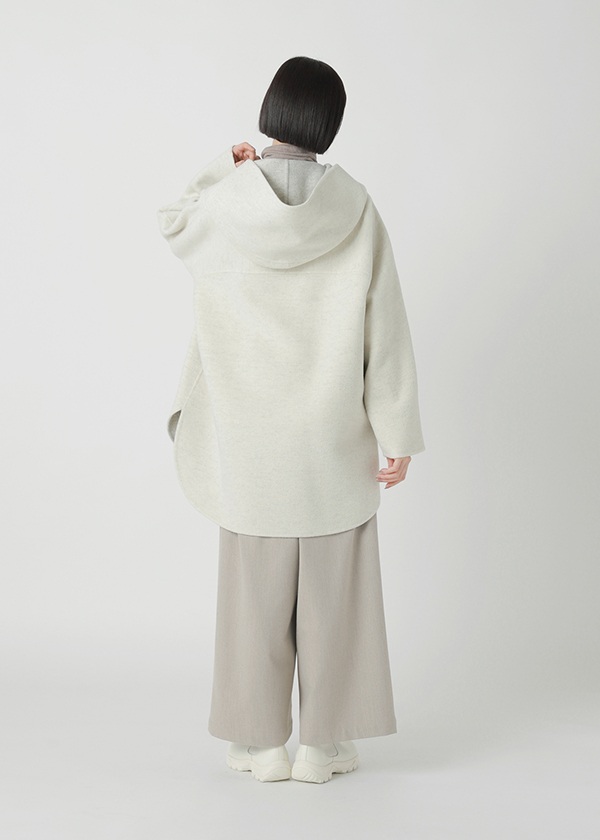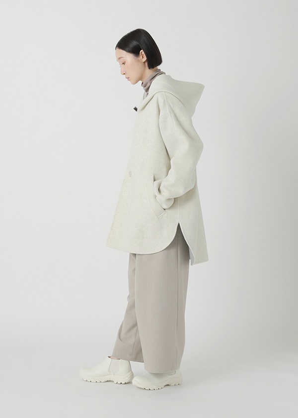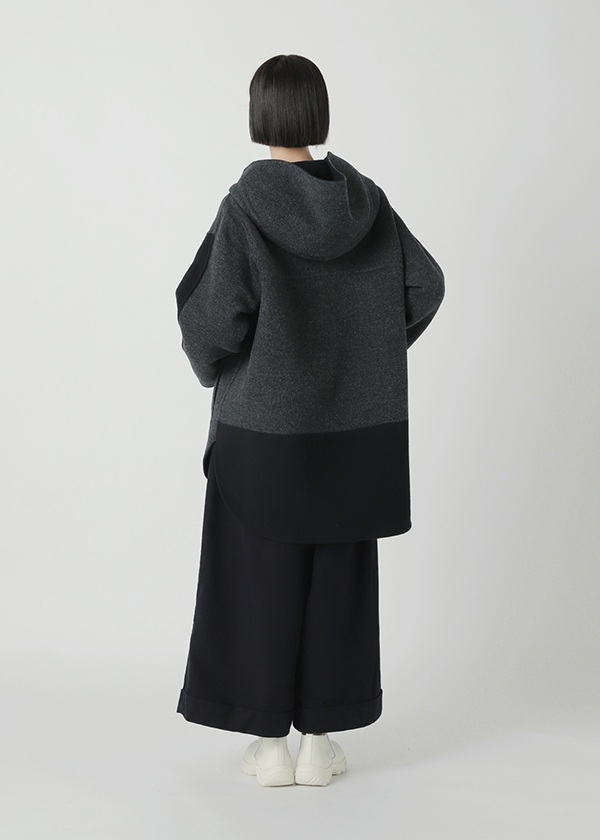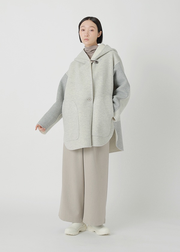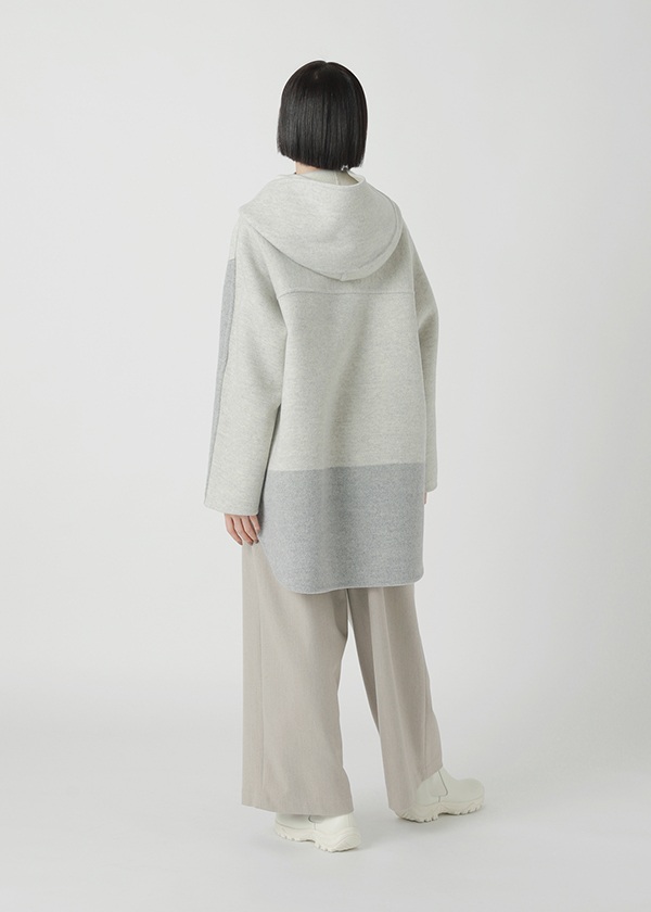 表にはニュージーランド産のキーウィラム、裏にはオーストラリア産のタスマニアラムを用い、マットな質感の二重織に仕上げたリバー仕立てのコート。素材にはビーバー加工を施し、上品な光沢とやさしい肌触りを実現しました。上質でありながらリラックス感のある風合いが魅力です。表側は無地でマットなシックさを演出し、裏側にはパネル状にツートーンのボーダーを配してモダンな印象に。リバーシブルで異なる表情を楽しめる一着です。