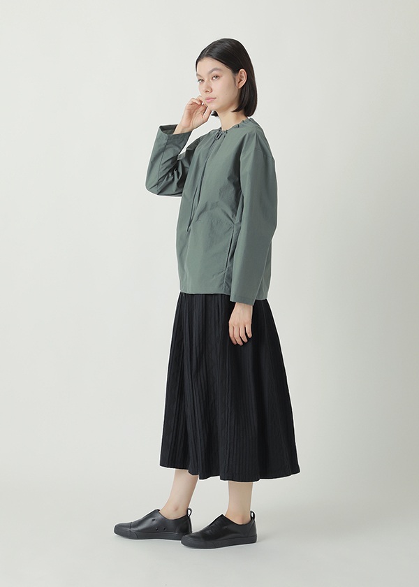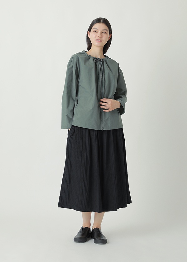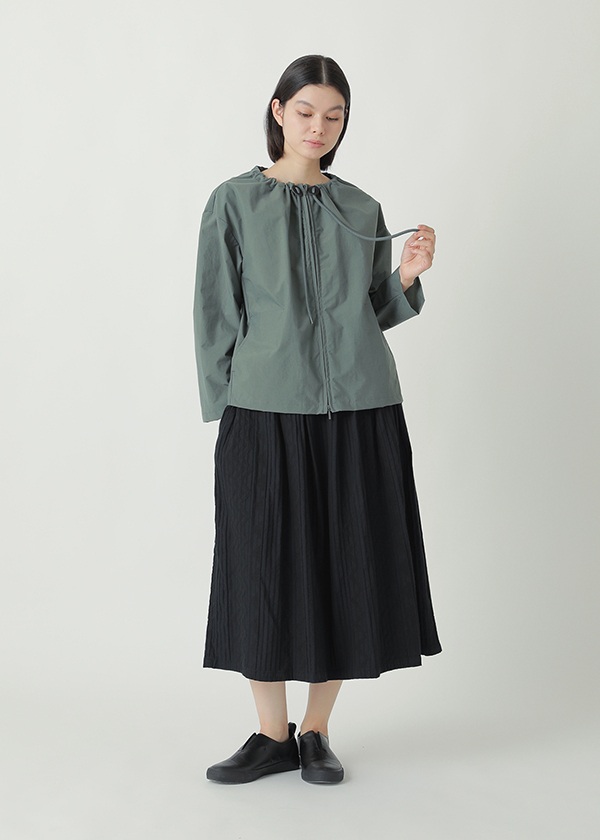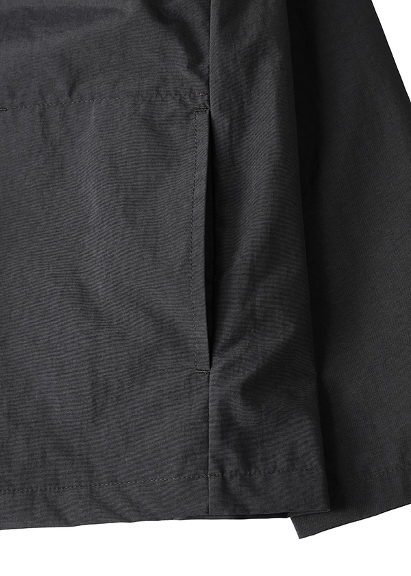 タスラン加工といわれる、糸に撚りをかけず空気の力で糸を絡める技術を施した糸で織り上げた、天然ライクで軽やかなナイロンタフタです。軽量でシワになりにくく耐久性もある素材で、撥水加工を施している機能性素材でもあります。