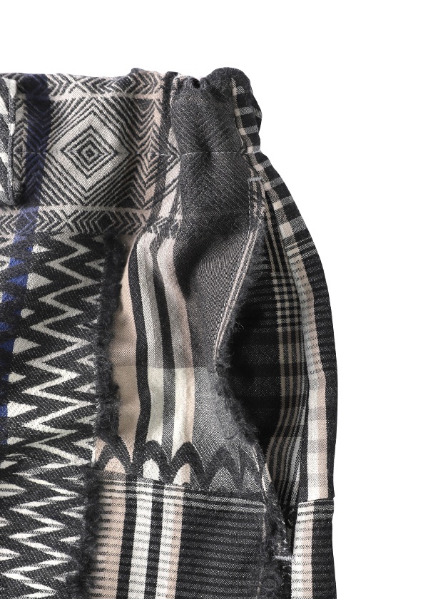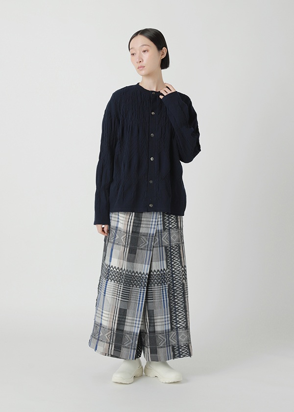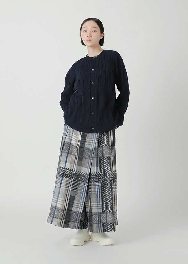 タテ糸に綿、ヨコ糸にウールを織り込み、ウォーム感のあるチェックを表現しました。綾織りで、歪みのあるチェック柄を形成。さらに太糸で刺繍を施したような柄を、表フリンジカットとして織り込みました。複雑に織り重なるジャカードが、奥行きのある豊かな風合いを生み出しています。