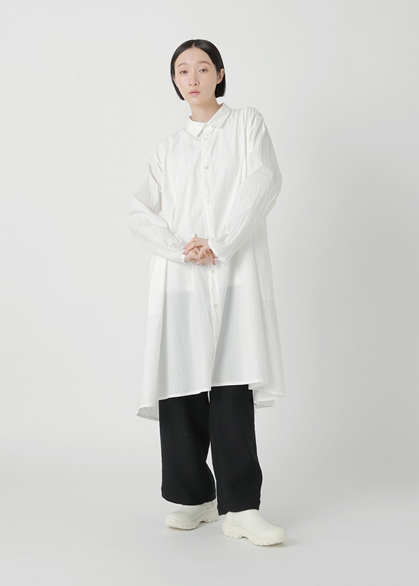 タテ糸・ヨコ糸ともにオーガニックコットンを使用したリップストップ生地。カジュアルでスポーティーな組織を、繊細でナチュラルな糸で織り上げました。製品加工により、マットな色味と自然な張りが生まれ、きれいなシルエットを楽しめる素材です。