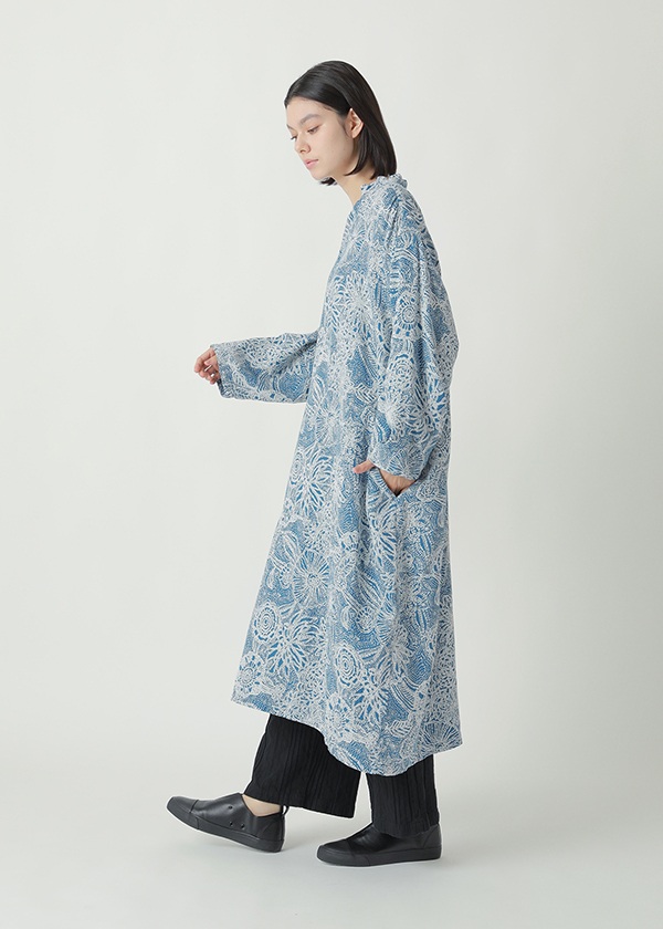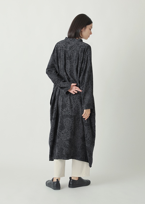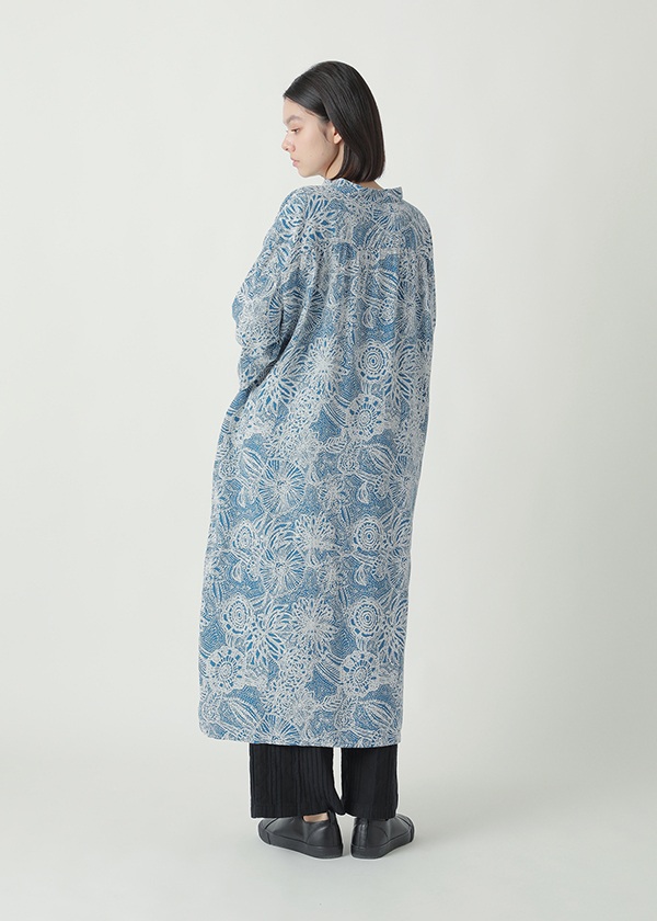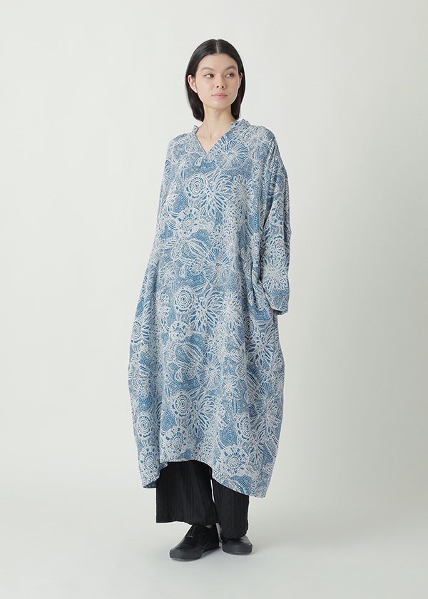 点描で花々を描き、風通ジャガードで表現しました。タテ糸にコットン・ヨコ糸にレーヨンを用いているので、仕上げに洗いをかけることで細やかなドット状の点からソフトな凸凹感のある表情が生まれました。レーヨンのドレープ感が上品な、着心地軽やかな風通JQです。