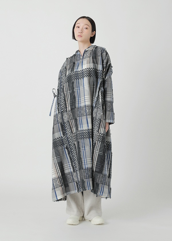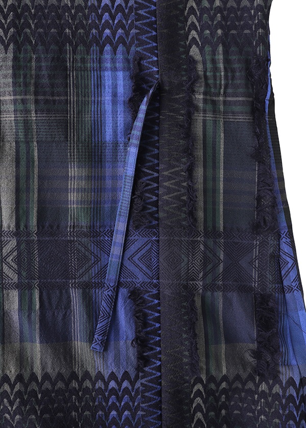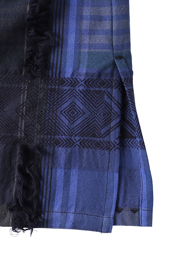 タテ糸に綿、ヨコ糸にウールを織り込み、ウォーム感のあるチェックを表現しました。綾織りで、歪みのあるチェック柄を形成。さらに太糸で刺繍を施したような柄を、表フリンジカットとして織り込みました。複雑に織り重なるジャカードが、奥行きのある豊かな風合いを生み出しています。