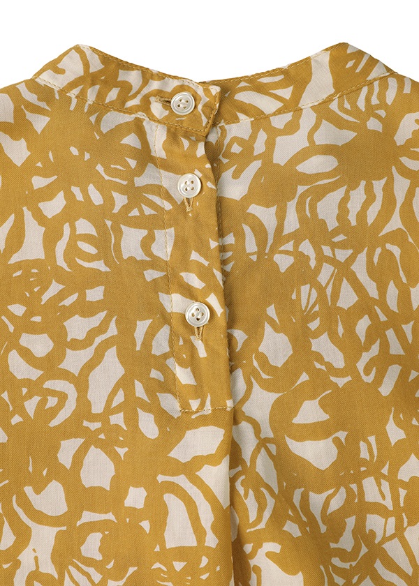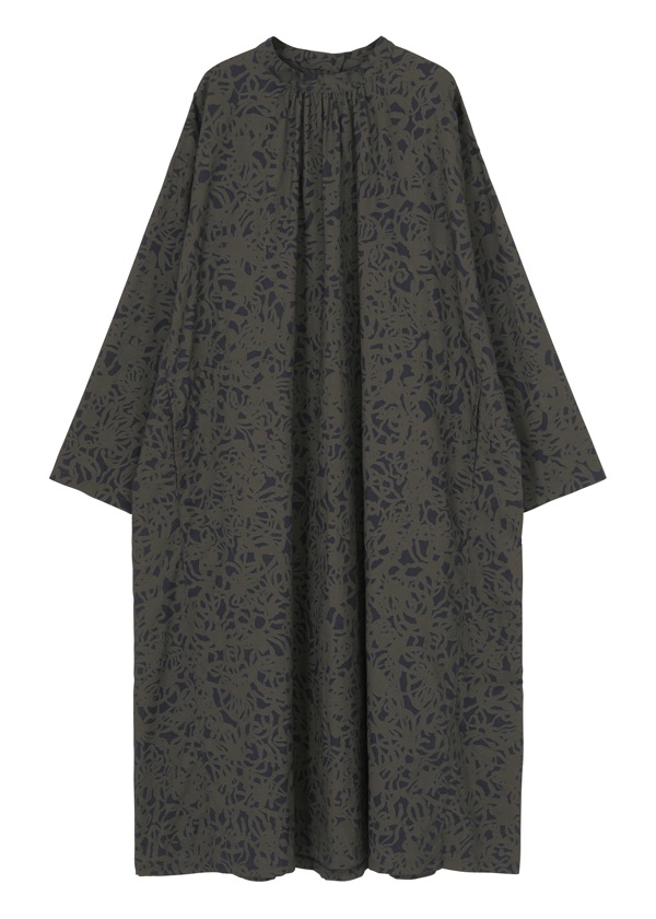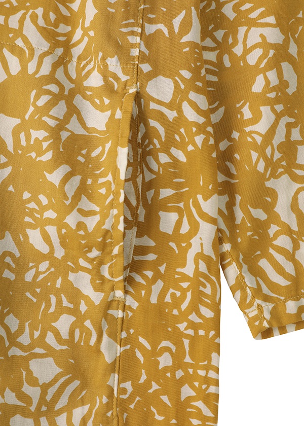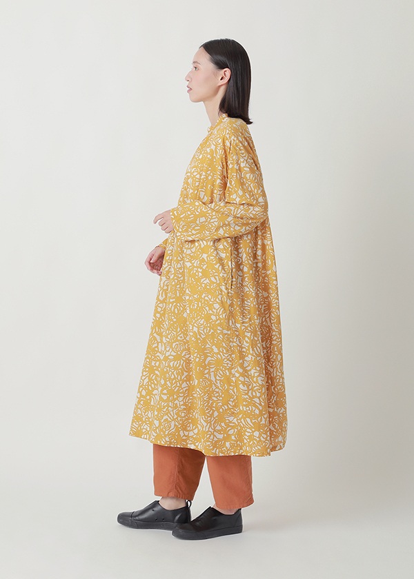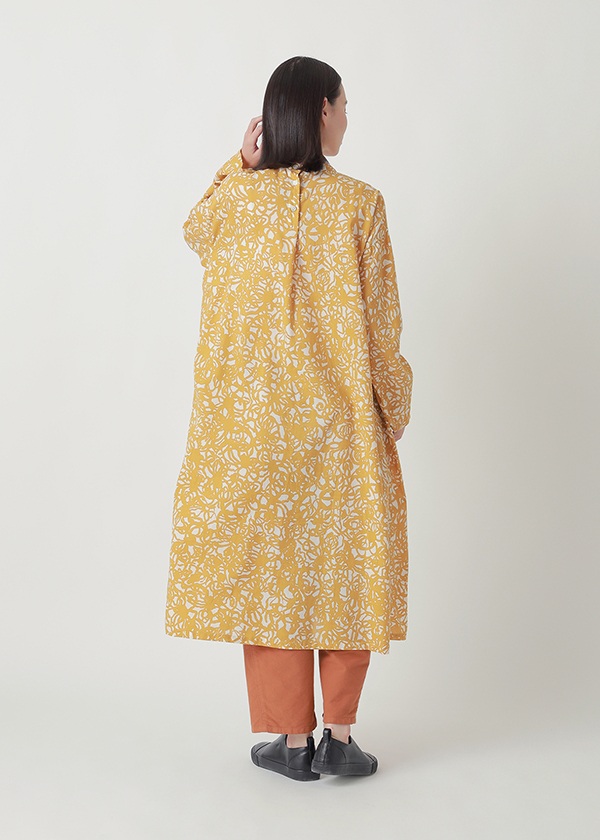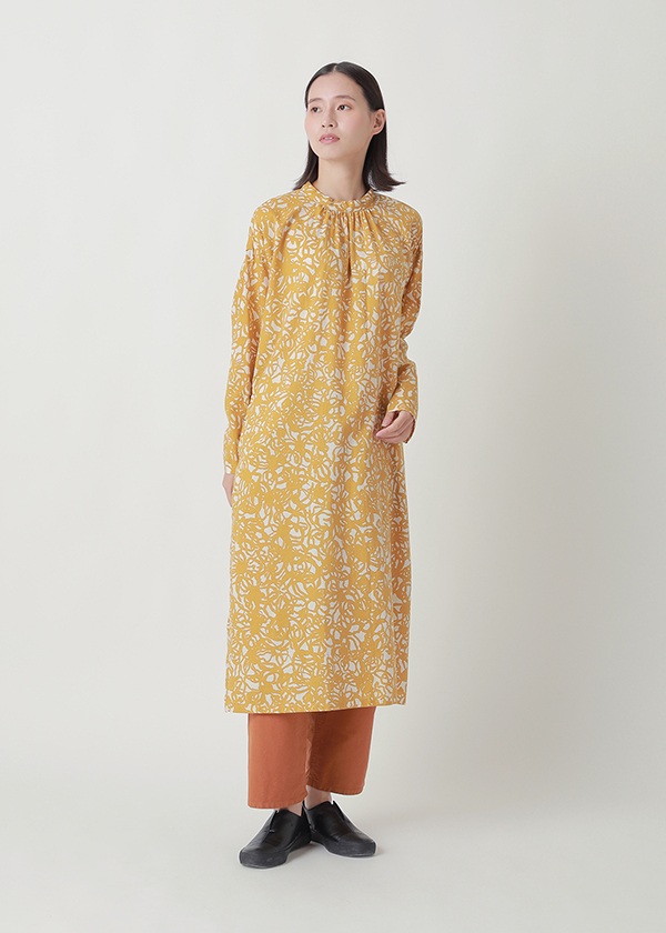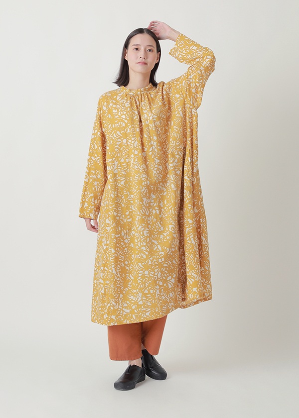 タテ糸に綿、ヨコ糸に少量のウールを混ぜた綿糸を使用し、綾織で仕上げた素材です。しなやかでドレープ性があり、ふくらみと軽さを感じられる生地にプリントを施しました。毛糸で描いたような膨らみのある線画の花柄を、立体感とウォーム感のある秋色で表現。少量のウール混ですがウォッシャブル仕様のため、お手入れが簡単で秋口に最適です。