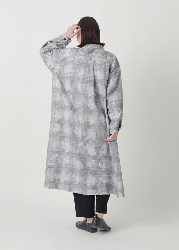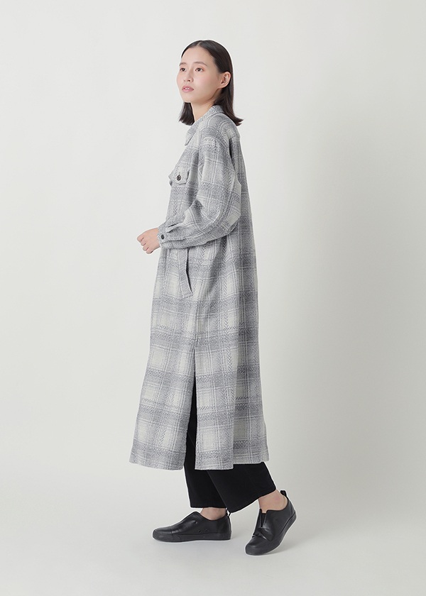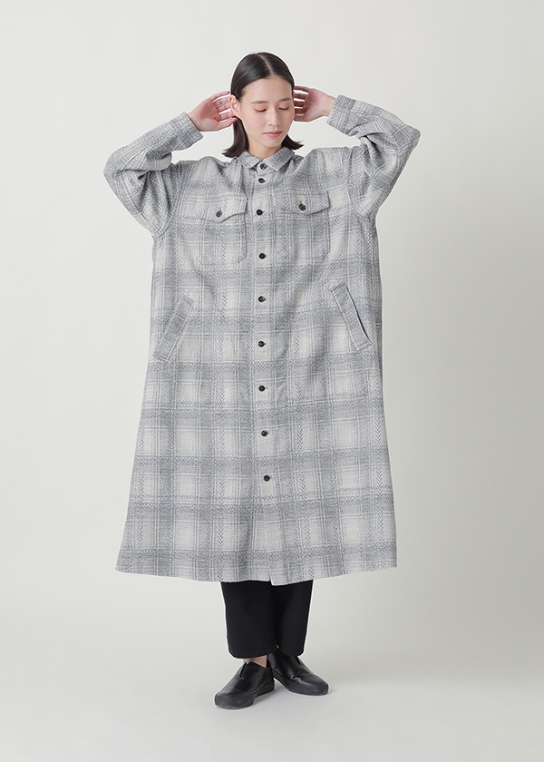 岡山地区のデニム織機を使用し、タテ糸に綿、ヨコ糸に梳毛ウールを用いて、チェックとヘリンボーンを組み合わせた柄をジャカードで織り上げました。綿とウールを組み合わせたヨコ二重織りの生地に製品加工を施すことで、軽やかなふくらみとウォーム感を実現しています。