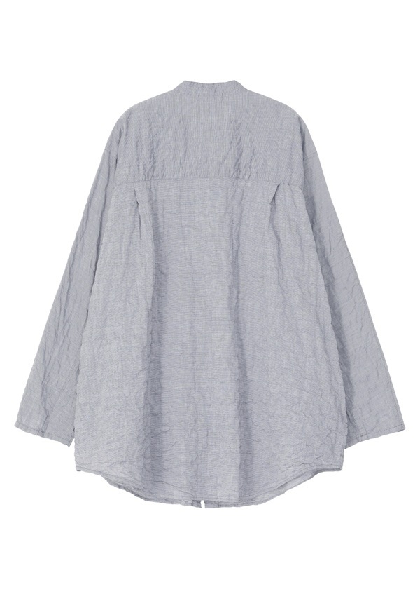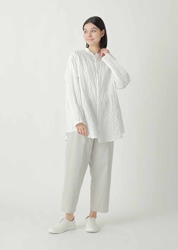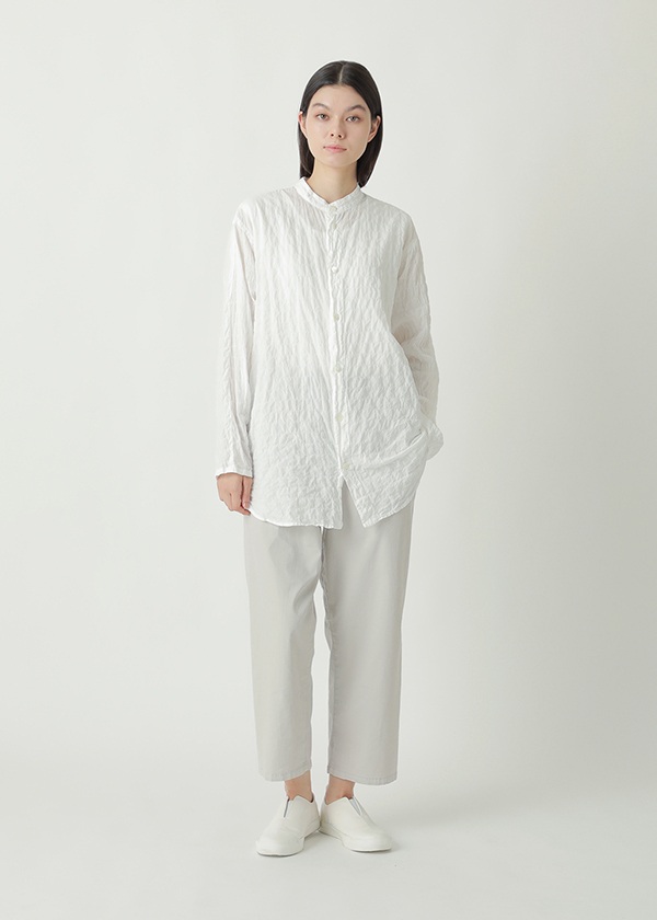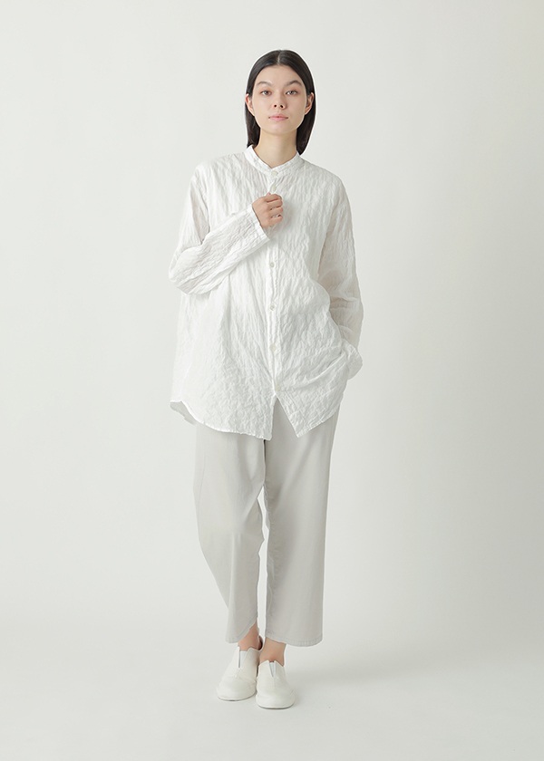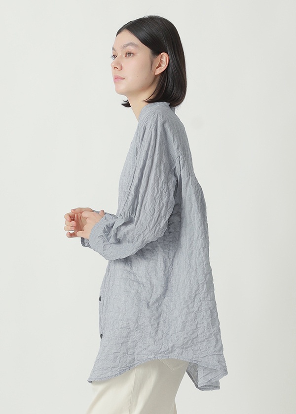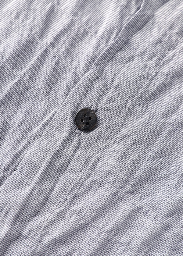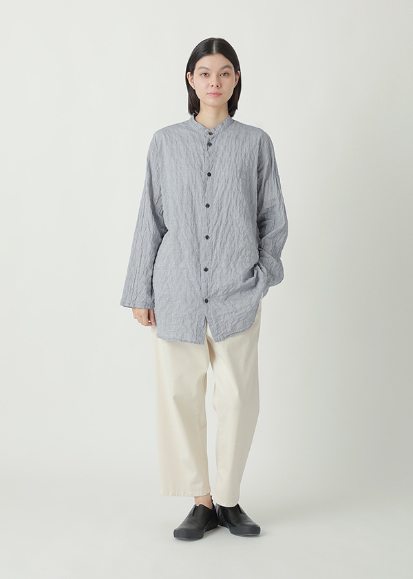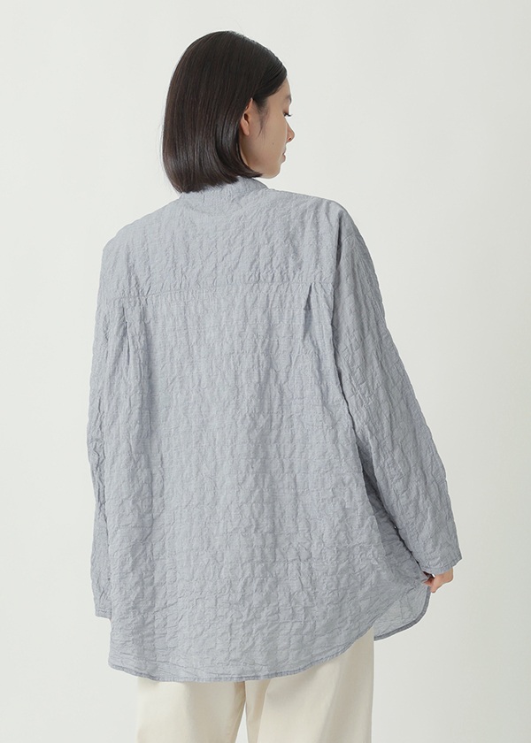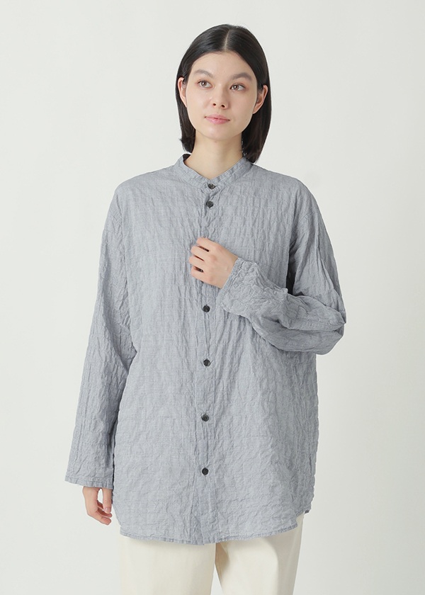 軽やかで柔らかく心地よい素材です。製品を作ってから洗いをかけることで、タテヨコにチェック状に配したストレッチの糸が縮み、動きのあるシャツ素材に仕上がりました。