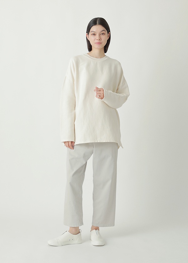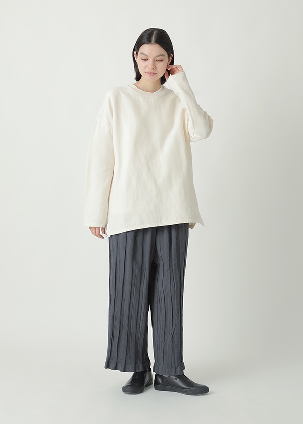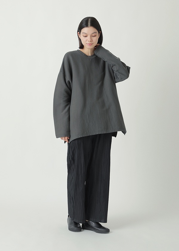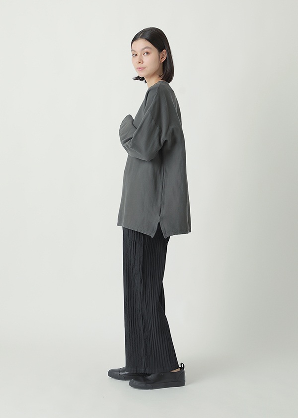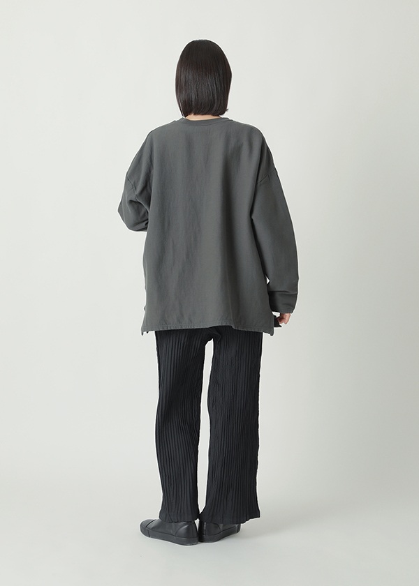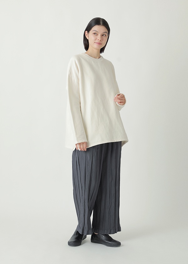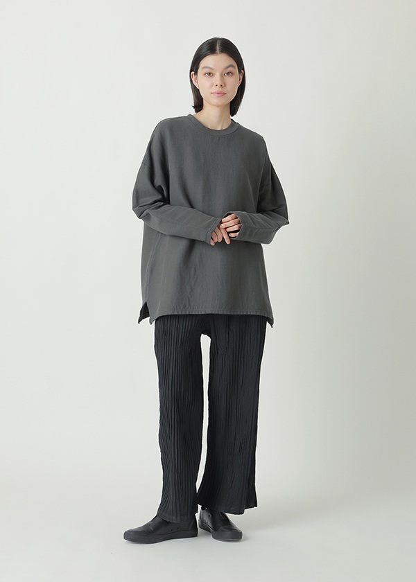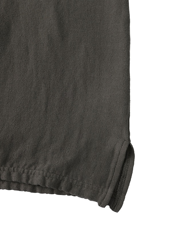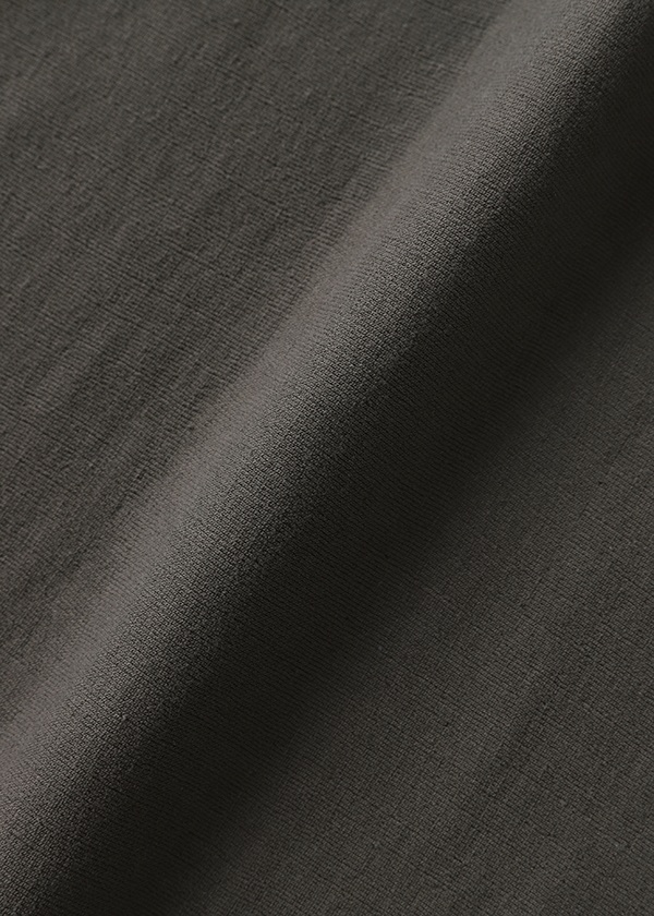 カットソー感覚でサラッと着られるYOORYUU Tの厚手ヴァージョンです。YOORYUUやYOORYUU Tよりも、やや太番手の糸で二重に織り上げ細かいピケ柄のエンボス加工を施しました。二重組織ならではの膨らみがありながら、強撚のドライ感も併せ持つ素材は、まだまだ暑さを感じる初秋にピッタリです。