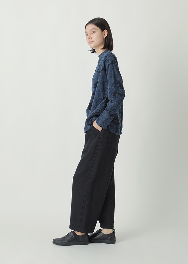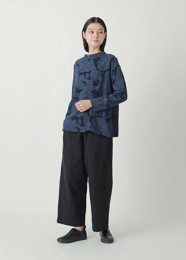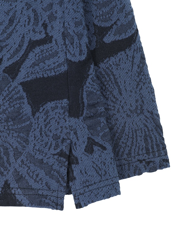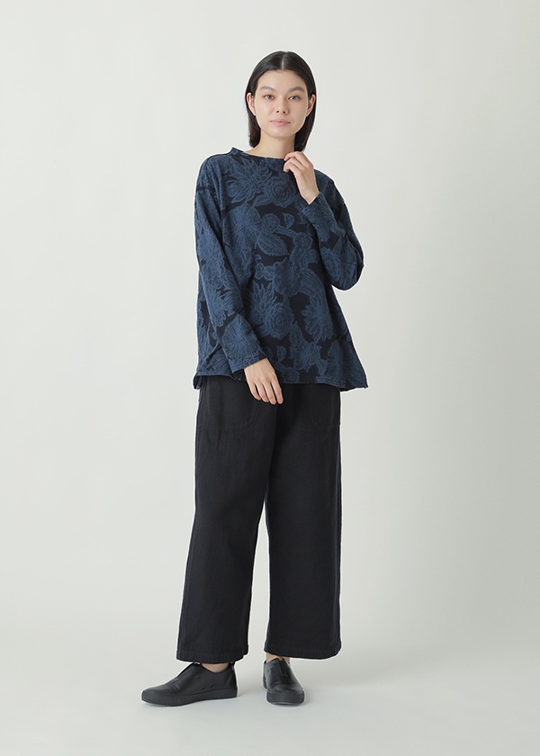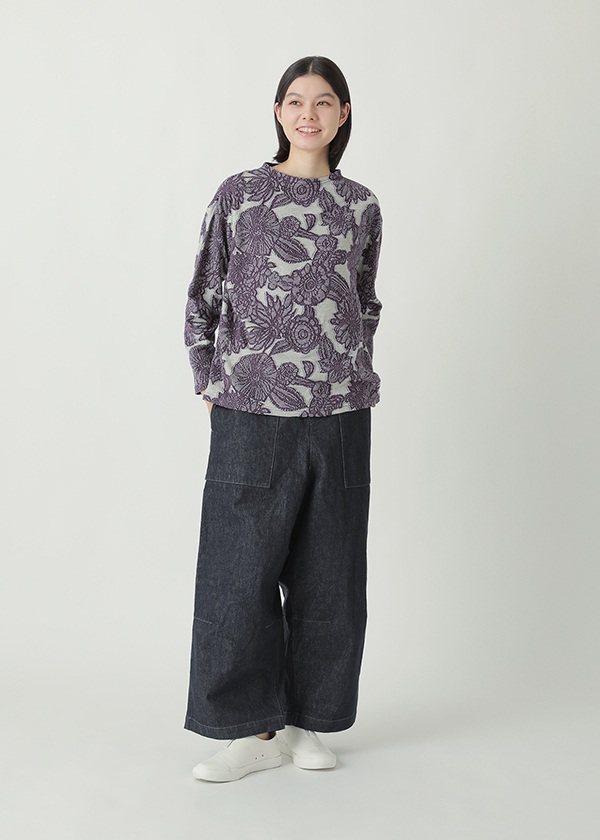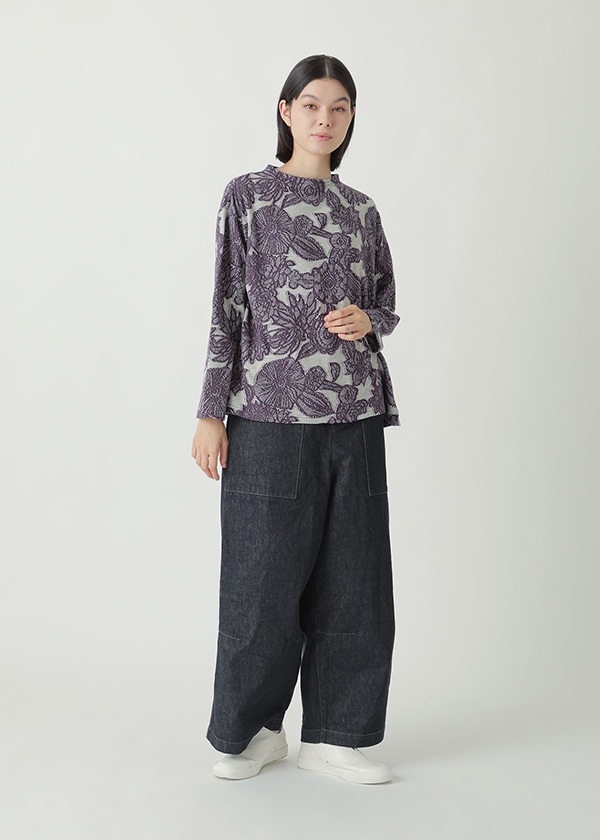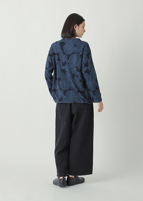 ドットと花柄を組み合わせ、太さの異なる糸を用いてインターシャ機で編み仕上げました。部分的に密度を詰めることで程よい凸凹を生みだし、肌当たり軽やかな着心地の良い素材に仕上げています。