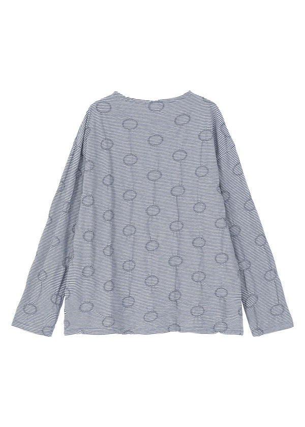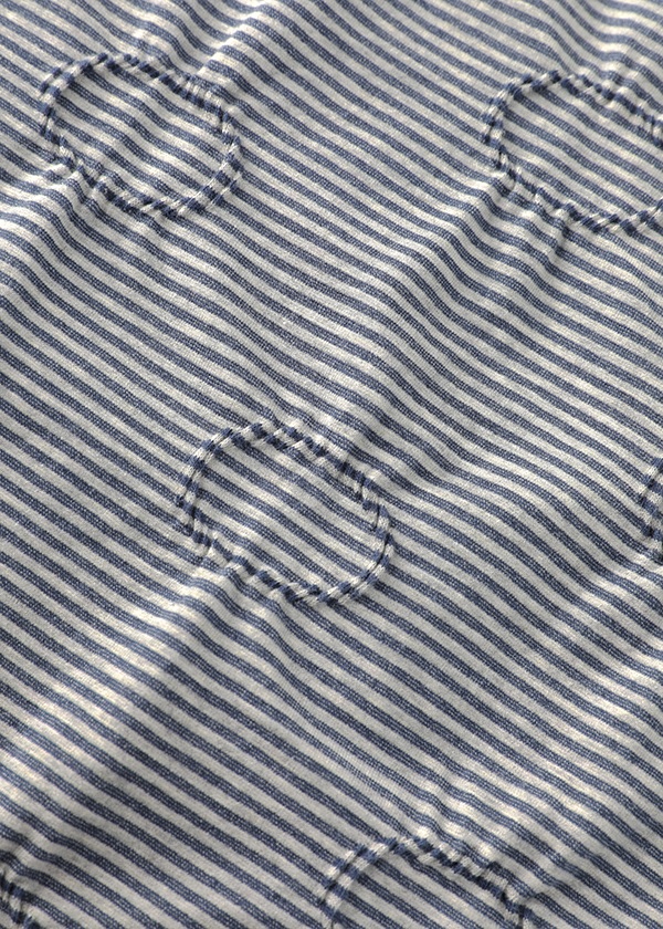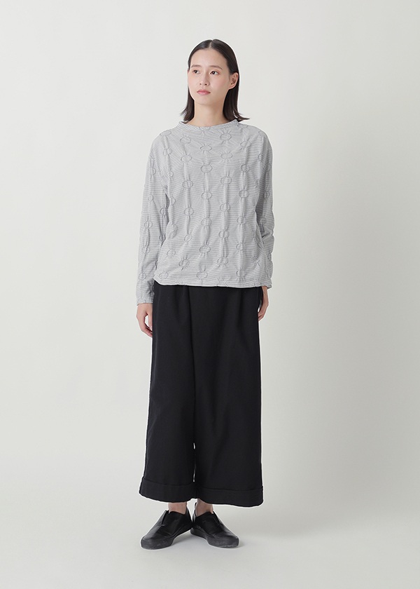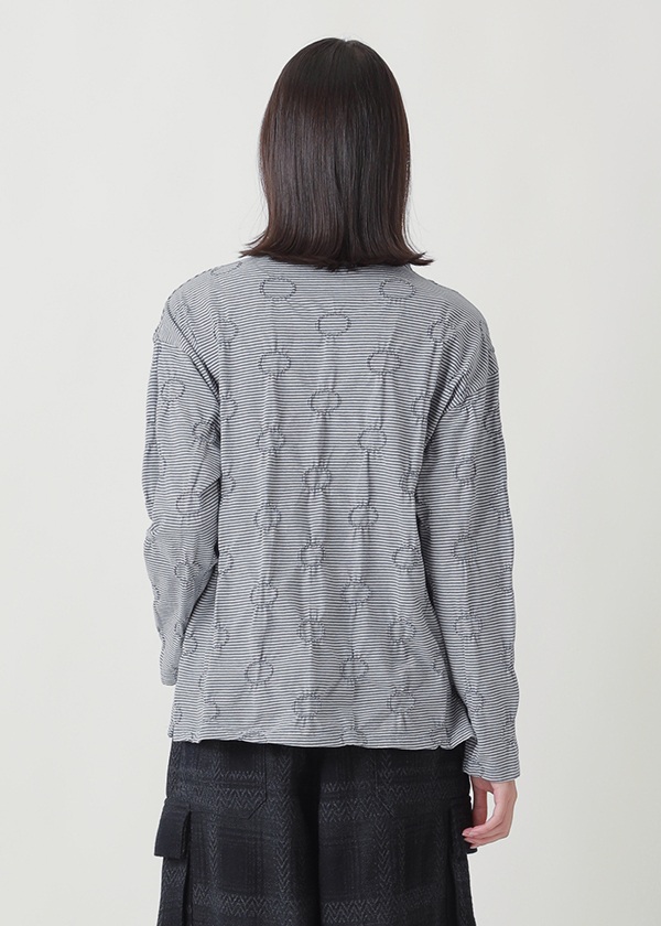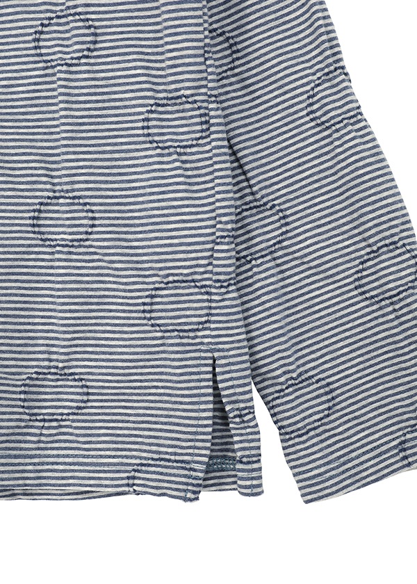 細ボーダーの天竺ベースにポリウレタンで柄の部分だけ凹凸を出す組織でドット柄を表現しています。