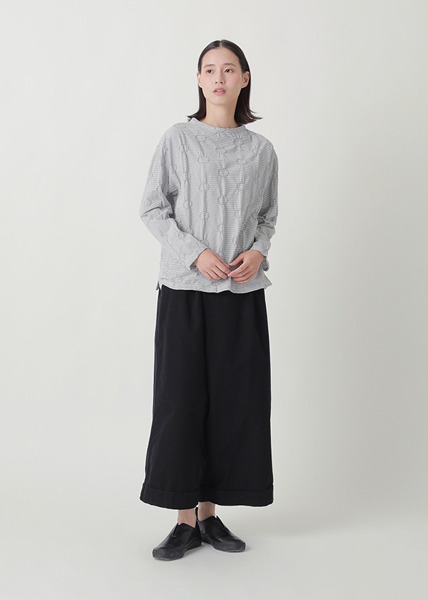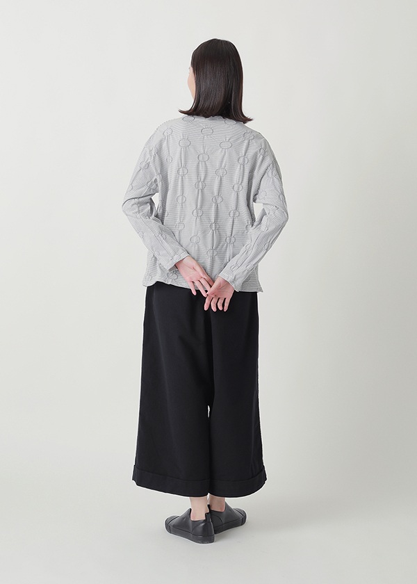 全体にストレッチ性がありますが細番手の糸を使用しているのでもたつきがなくさらっと軽さのある着心地です。
