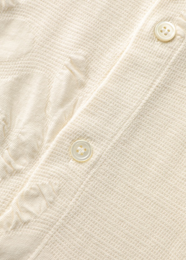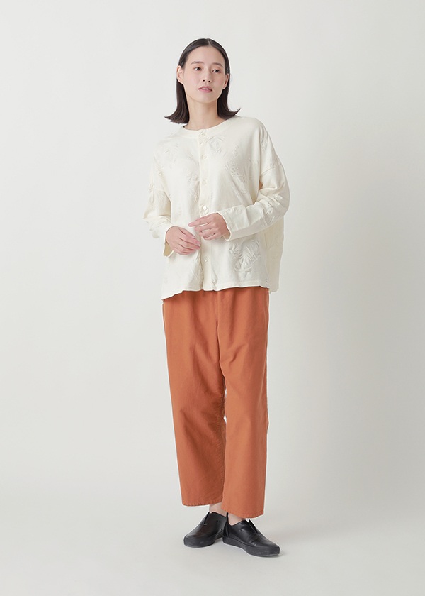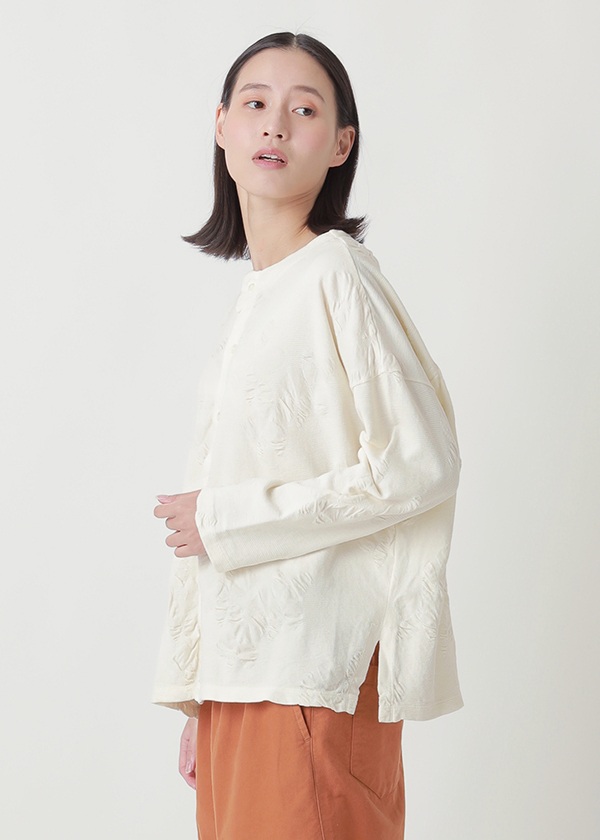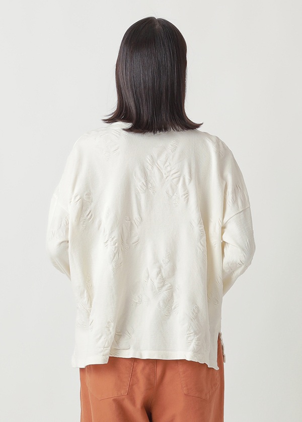 表面が滑らかで光沢のある綿コーマを使用し、花の部分とグランド部分の編み組織を変えることで立体感のある表情を出しました。素材の表情がアクセントにもなる、柔らかく華やかな仕上がりの一着です。