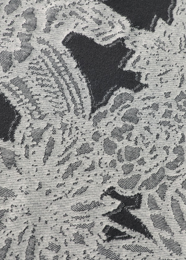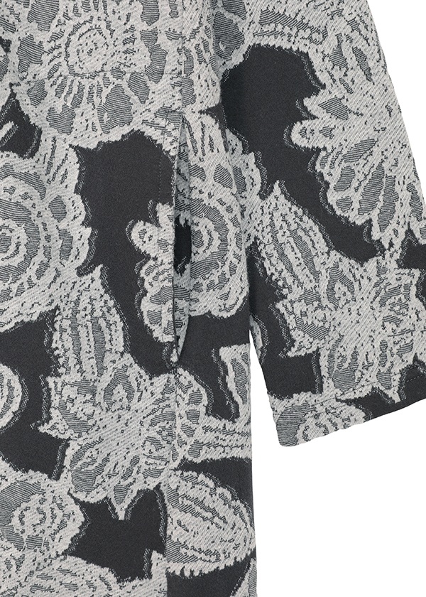 ドットと花柄を組み合わせ、太さの異なる糸を用いてインターシャ機で編み仕上げました。部分的に密度を詰めることで程よい凸凹を生みだし、肌当たり軽やかな着心地の良い素材に仕上げています。