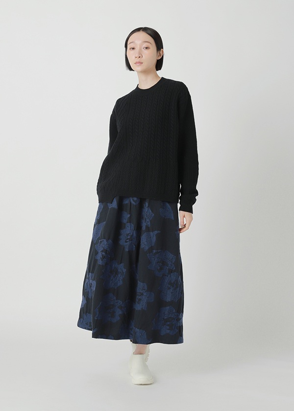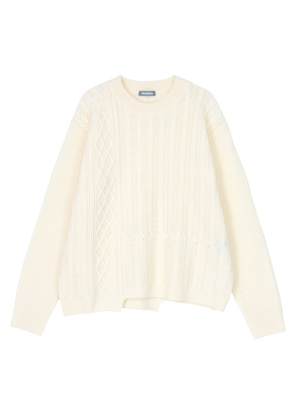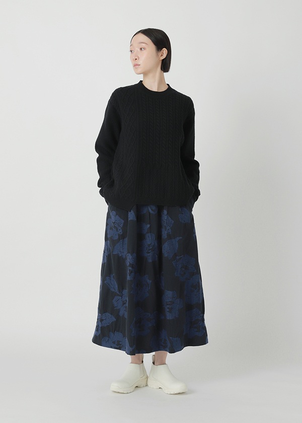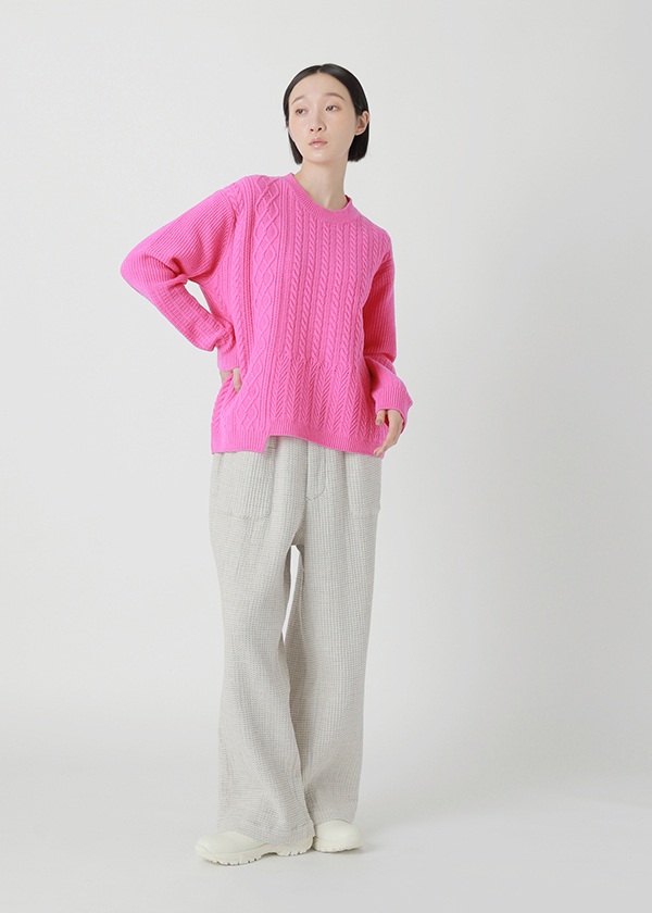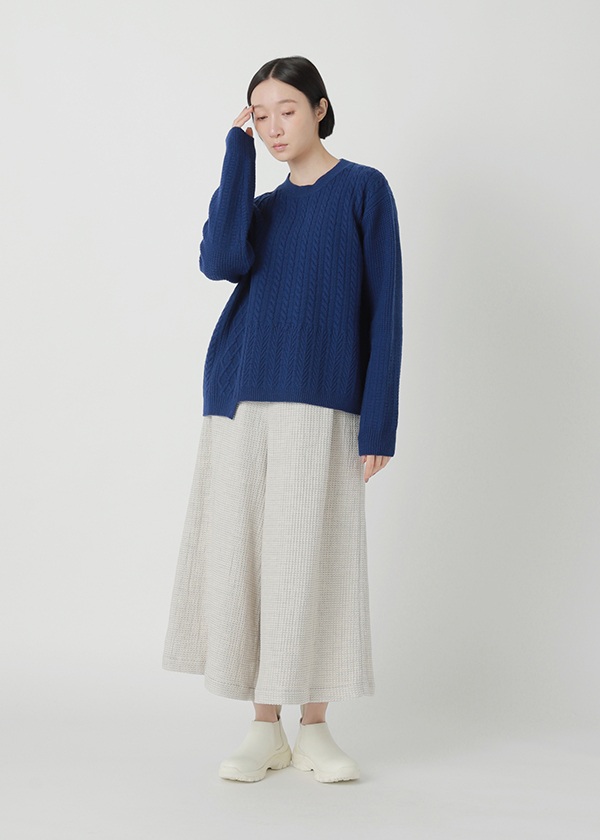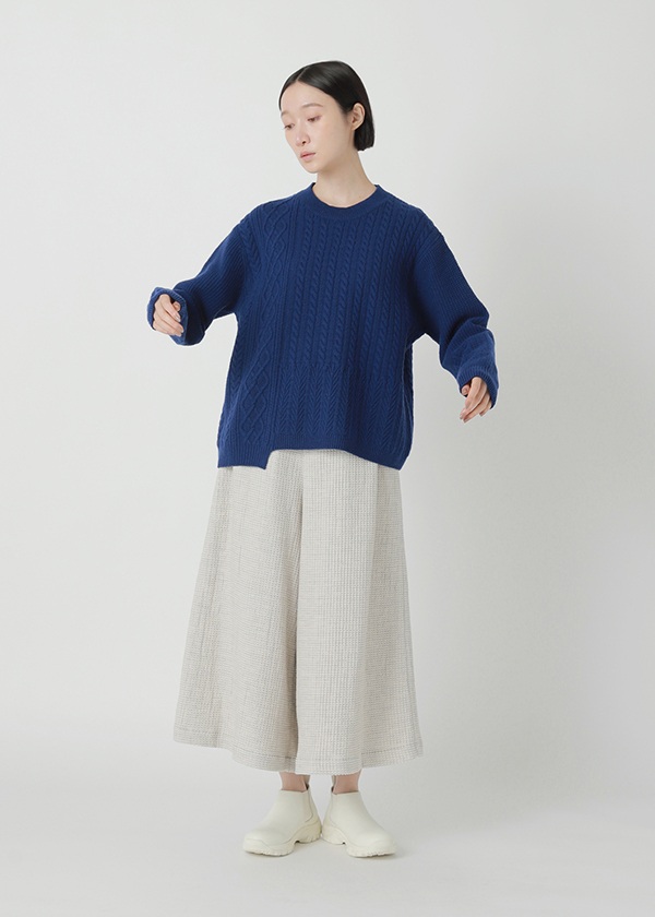 フランス産メリノウールを使用しています。他の産地のメリノウールよりバルキー性・保湿性に優れているので、軽くて暖かい仕上がりです。ケーブル柄をミックスしてパネル状に配置しています。