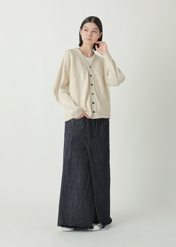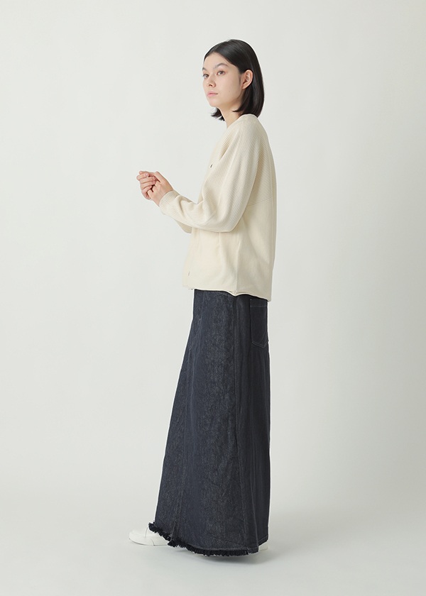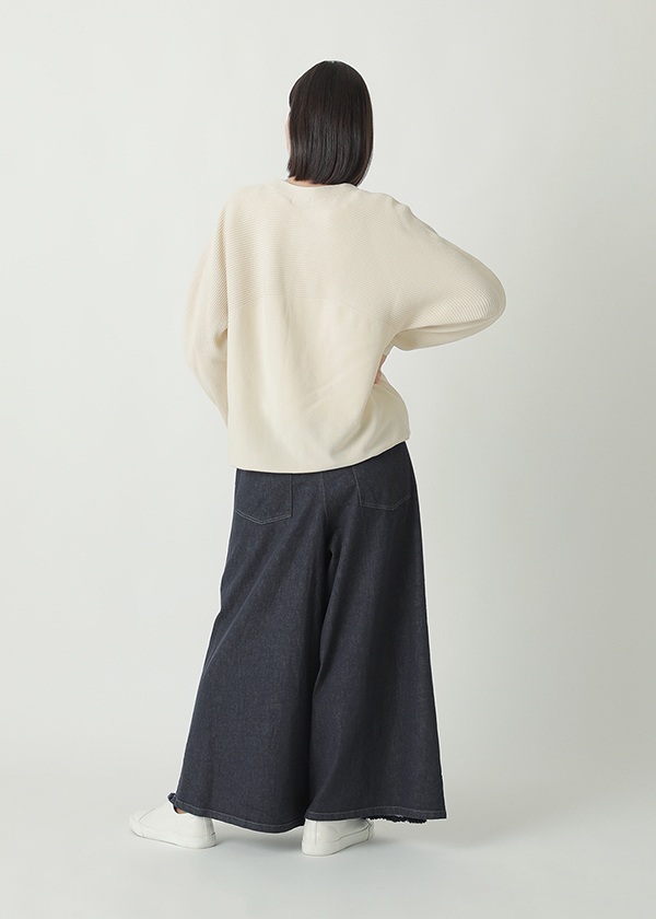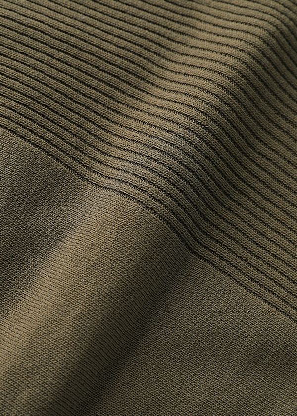 適度な伸縮性と張り感が出るように綿とストレッチ性のあるポリエステルの糸を使って編みました。袖から身頃にかけて走るリブは、ホールガーメントならではの表現です。着用した時の立体感のあるシルエットが特徴的な、肌馴染みのよい着心地軽やかな一着です。