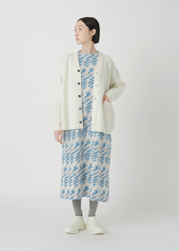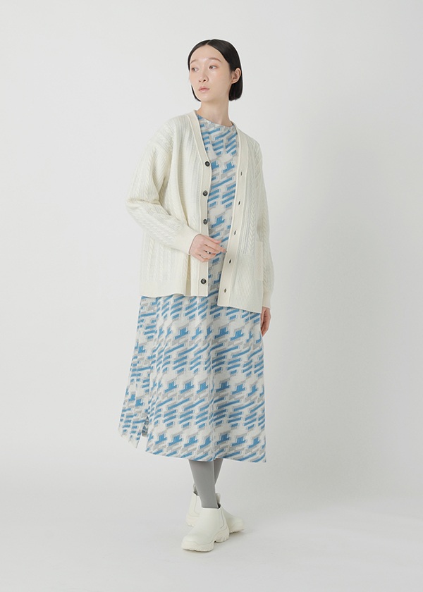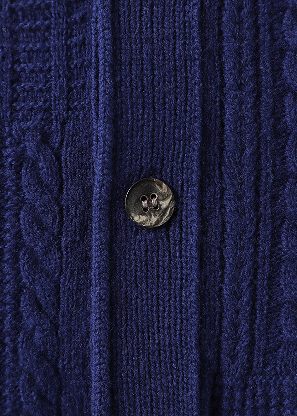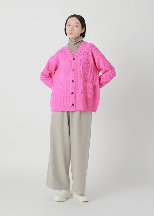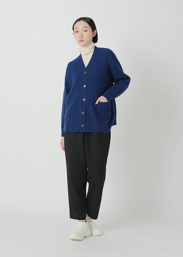 フランス産メリノウールを使用しています。他の産地のメリノウールよりバルキー性・保湿性に優れているので、軽くて暖かい仕上がりです。ケーブル柄をミックスしてパネル状に配置しています。
