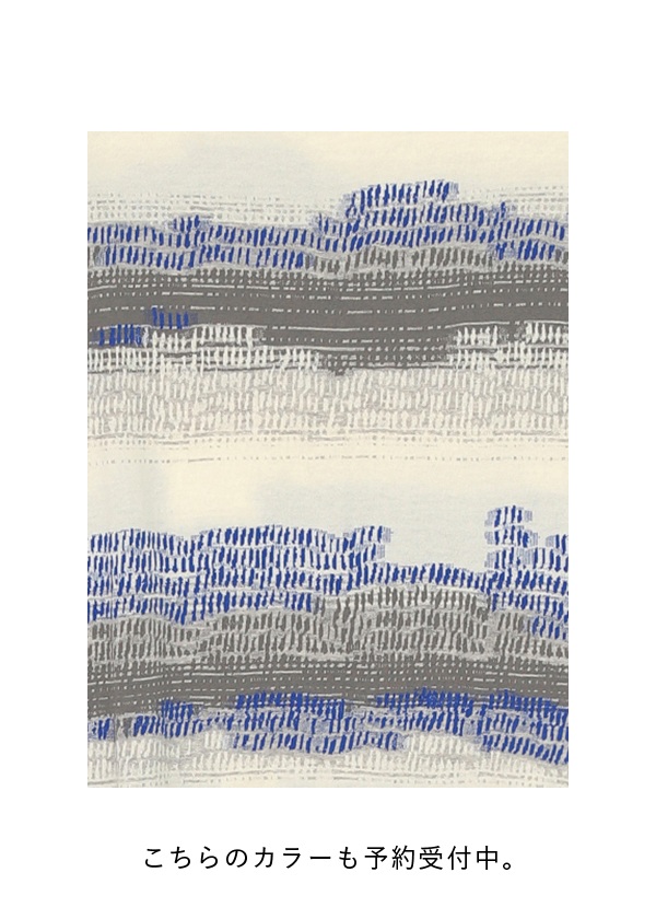 ハンドステッチの刺し子のような複雑な柄を、番手や組織の違う糸で表現し、凹凸のある豊かな表情を出した変形ボーダー柄です。カラーによっても表情が変わり、まるで一日の中で移り変わる海辺の空の風景のように、多彩な表情を楽しめます。