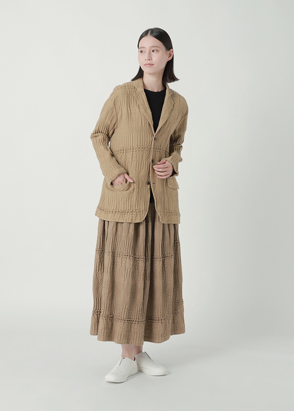 岡山地区のデニム織機で、タテ糸に綿、ヨコ糸にラミーリネンを使用して織り上げた〈WAVE〉シリーズ。製品加工によって生まれる、クラフト感のあるウェーブが特徴です。2026S/Sでは、さまざまな陶器(ポタリー)のシルエットや技法、モチーフから着想を得た柄をWAVE柄と組み合わせてデザイン。2つの異なる柄が織りなす複雑な柄域が、独特の奥行きと存在感をもたらす素材です。