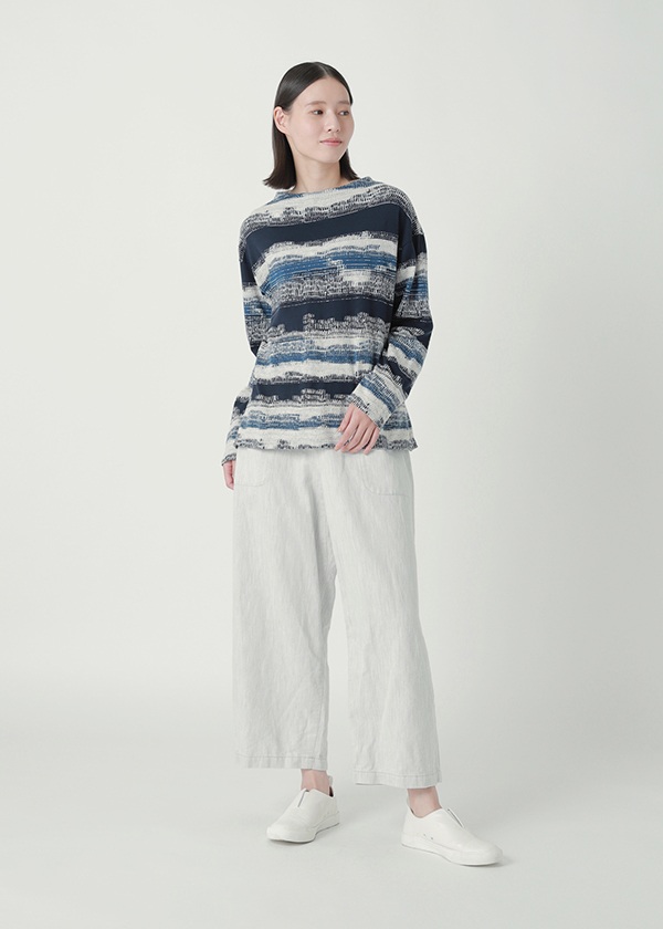 岡山地区のデニム織機で、タテ糸の本数をできる限り抑えて織り上げた、ナチュラルでクラフト感のあるプランテーションオリジナルの定番デニムです。タテ糸・ヨコ糸ともに綿糸を使用した、コットン100%の素材で、オールシーズン着まわせる汎用性の高さも魅力です。