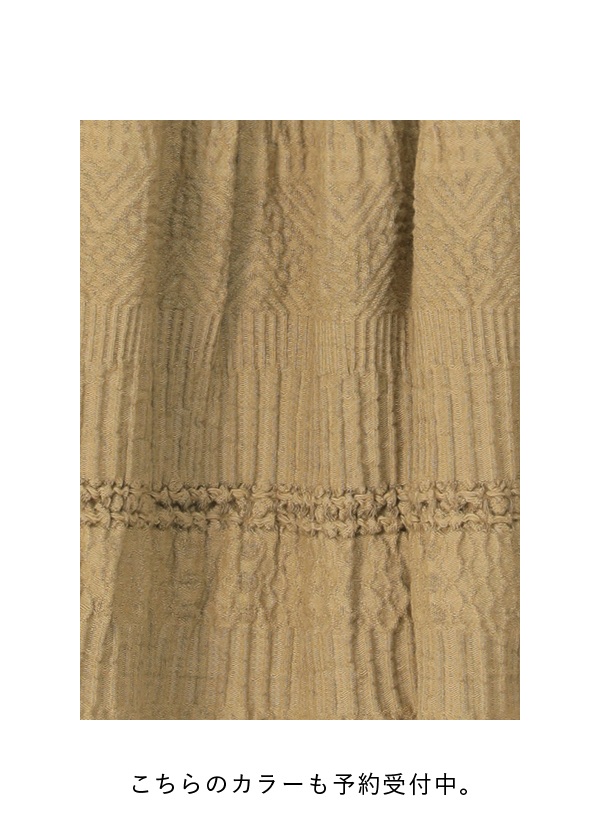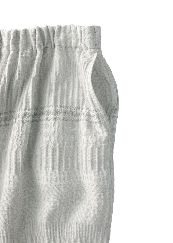 岡山地区のデニム織機で、タテ糸に綿、ヨコ糸にラミーリネンを使用して織り上げた〈WAVE〉シリーズ。製品加工によって生まれる、クラフト感のあるウェーブが特徴です。2026S/Sでは、さまざまな陶器(ポタリー)のシルエットや技法、モチーフから着想を得た柄をWAVE柄と組み合わせてデザイン。2つの異なる柄が織りなす複雑な柄域が、独特の奥行きと存在感をもたらす素材です。