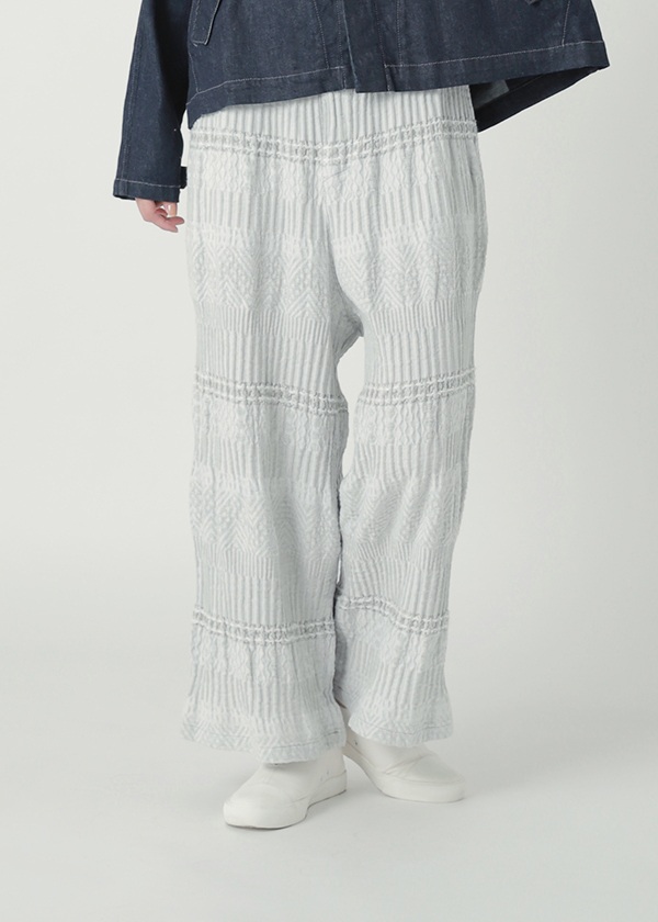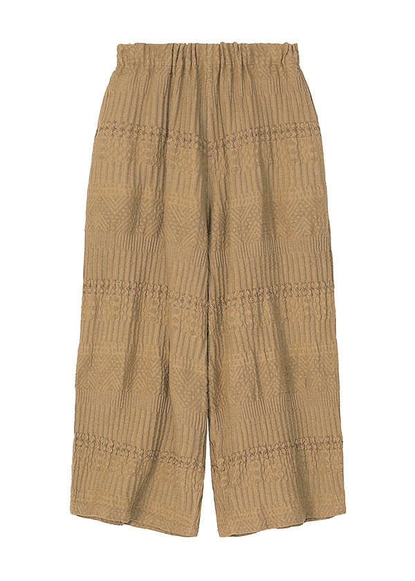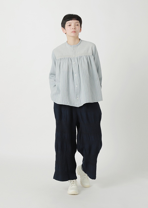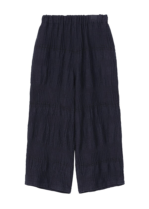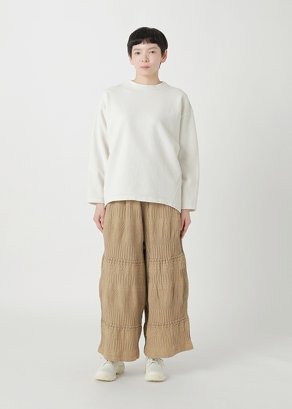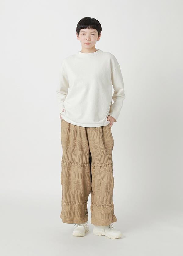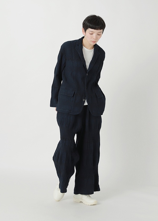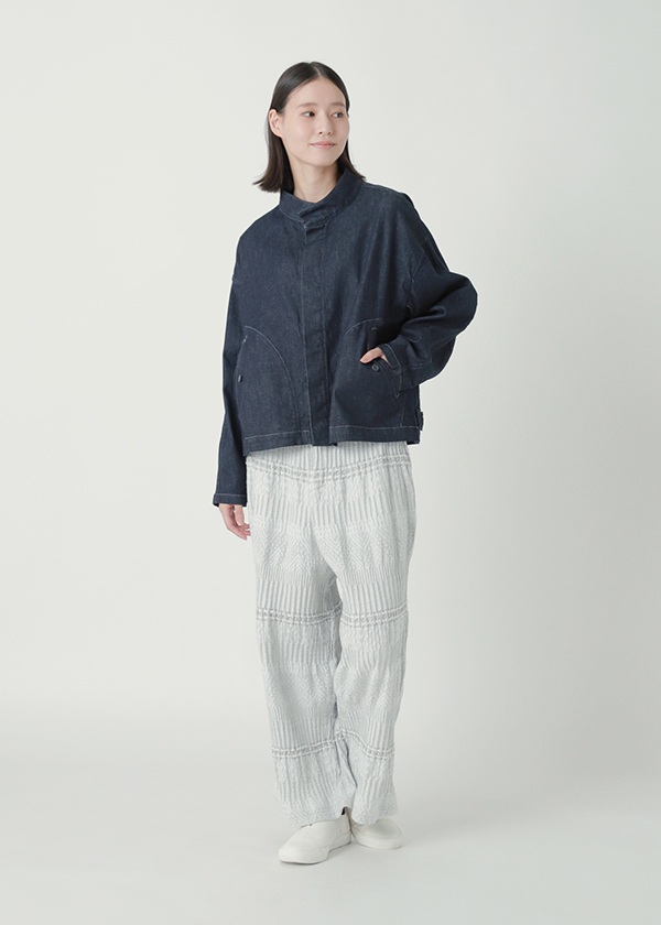 奥行きのあるクラフト感素材「BIZENポタリーウェーブ」〈素材について〉岡山地区のデニム織機で、タテ糸に綿、ヨコ糸にラミーリネンを使用して織り上げた〈WAVE〉シリーズ。製品加工によって生まれる、クラフト感のあるウェーブが特徴です。2026S/Sでは、さまざまな陶器(ポタリー)のシルエットや技法、モチーフから着想を得た柄をWAVE柄と組み合わせてデザイン。2つの異なる柄が織りなす複雑な柄域が、独特の奥行きと存在感をもたらす素材です。●関連アイテム●同素材のジャケット→CLICK同素材のスカート→CLICK同素材のワンピース→CLICKこちらの製品は独特な風合いを出すため、製品染めを行っております。1点ごとにサイズや風合い等、特徴が異なりますのでご了承ください。ご家庭で手洗い可能です。日本製※商品のカラーは、商品単体の画像をご参照ください。