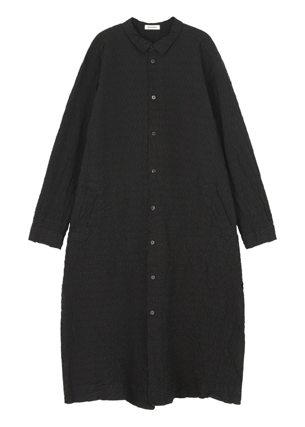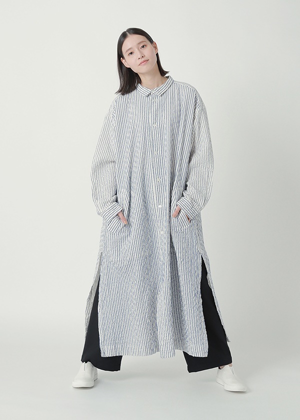 ヨコ糸の一部に強撚糸を使用し、部分的に二重組織を取り入れることで、クシャッとした立体感のあるテクスチャーを表現しました。 太番手の糸で織り上げたストライプ状のステッチと、リズミカルな凹凸、そしてドライな肌触りが特徴のコットン100%素材です。