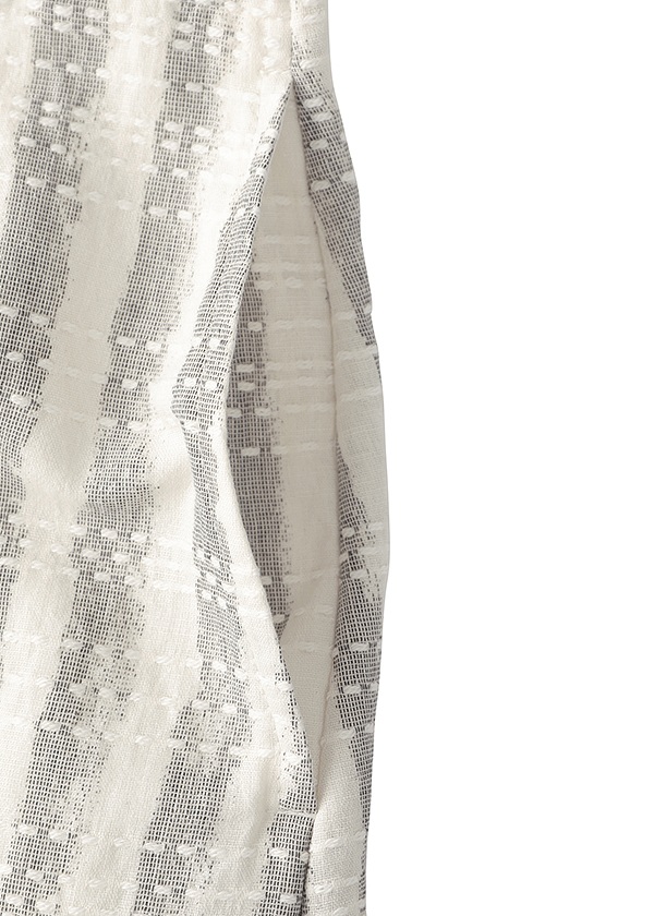 一部にマンガンという鉱物で染めた糸を使用し、その上から酸化・還元の溶剤でプリントを施すことで、柄の部分に黒と白のコントラストを生み出した、昔ながらの染色技術を用いた素材です。先染めで表現したサシコステッチと、手描き風のライン柄が複雑に重なり合い、伝統的な技法にモダンな感性を加えた独特の仕上がりになっています。