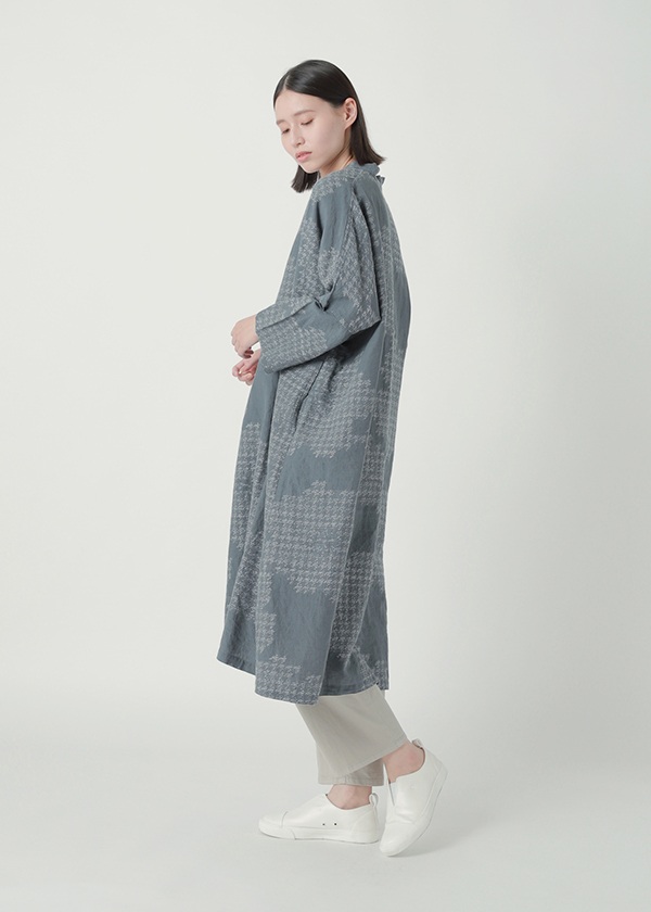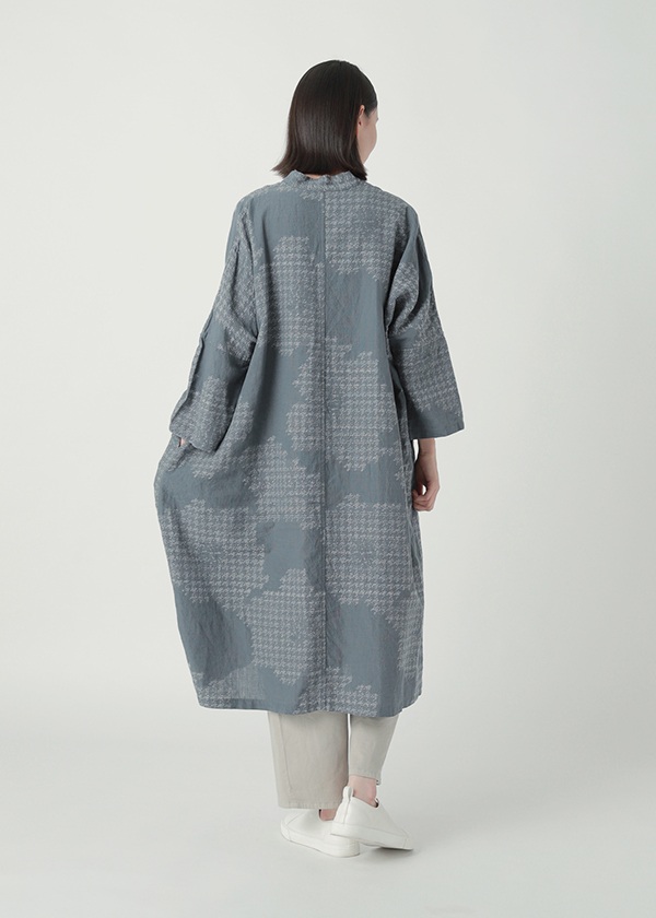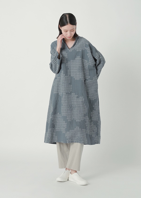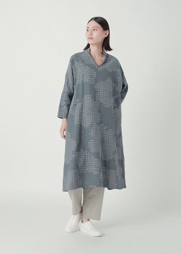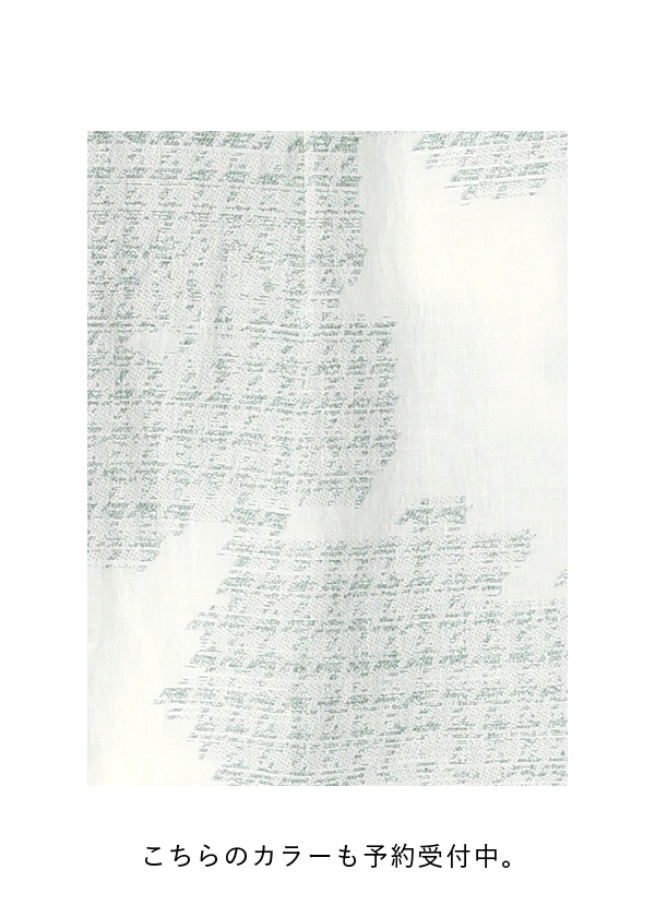 タテ糸・ヨコ糸ともに、リネン糸とコットン糸を一本ずつ交互に使い、大胆な花柄をジャガード織機で織り上げました。チドリ柄で構成された花のカットジャガードが、華やかで可憐な印象を演出します。リネン混ならではのドライな風合いと、涼やかな着心地が魅力の素材です。