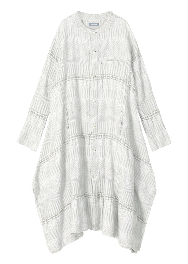 岡山地区のデニム織機で、タテ糸に綿、ヨコ糸にラミーリネンを使用して織り上げた〈WAVE〉シリーズ。製品加工によって生まれる、クラフト感のあるウェーブが特徴です。2026S/Sでは、さまざまな陶器(ポタリー)のシルエットや技法、モチーフから着想を得た柄をWAVE柄と組み合わせてデザイン。2つの異なる柄が織りなす複雑な柄域が、独特の奥行きと存在感をもたらす素材です。