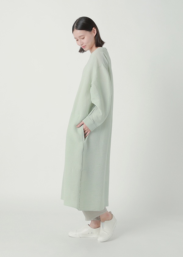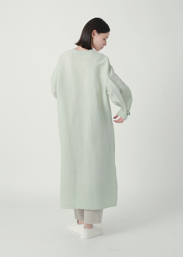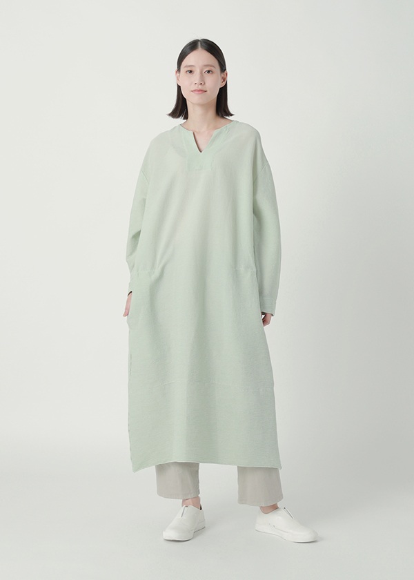 楊柳とは、ヨコ糸に強撚糸を使い、縦方向に筋のようなシボを織り出した生地のことです。シボのおかげで肌離れがよく、さらさらとした触り心地で涼しく、吸水速乾性にも優れています。Plantationでは、この楊柳のシボをボーダー状に配し、生地に適度な張り感とバネのようなリズミカルな動きをプラスしました。色展開が豊富で、インナーやアウター、他の素材との重ね着でも楽しめるシリーズです。