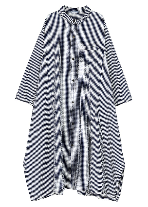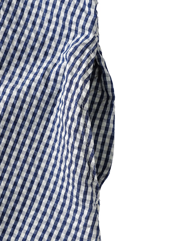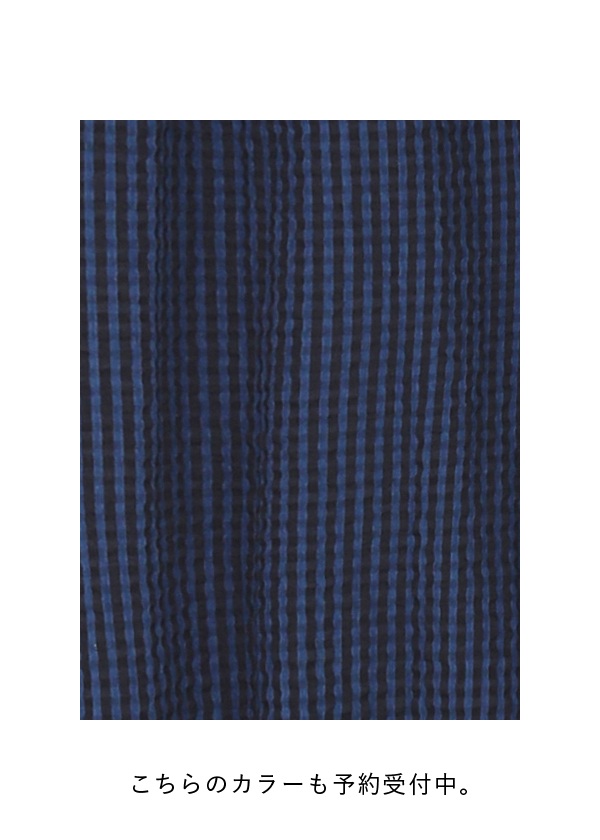 岡山地区の織機で、ピュアインディゴと反応染料を使いギンガムチェックを織り上げました。タテ糸とヨコ糸の太さの違いと密度の違いを活かして凹凸感を表現。細番手の高密度ならではのドライな風合いと、ほどよい柔らかさが調和した、Plantationらしいギンガムチェックです。