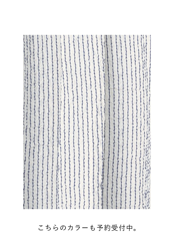太番手の糸で織り上げたストライプ状のステッチと、リズミカルな凹凸、そしてドライな肌触りが特徴のコットン100%素材です。