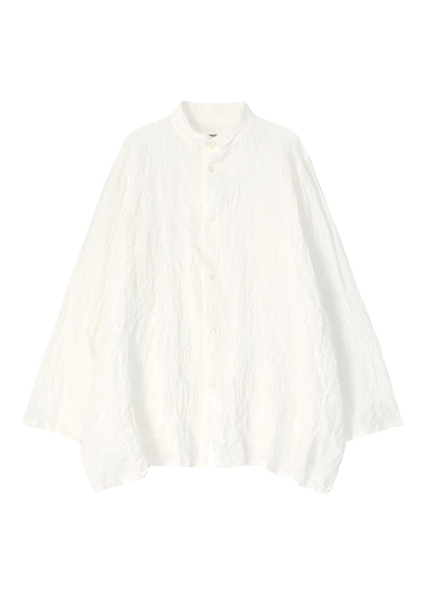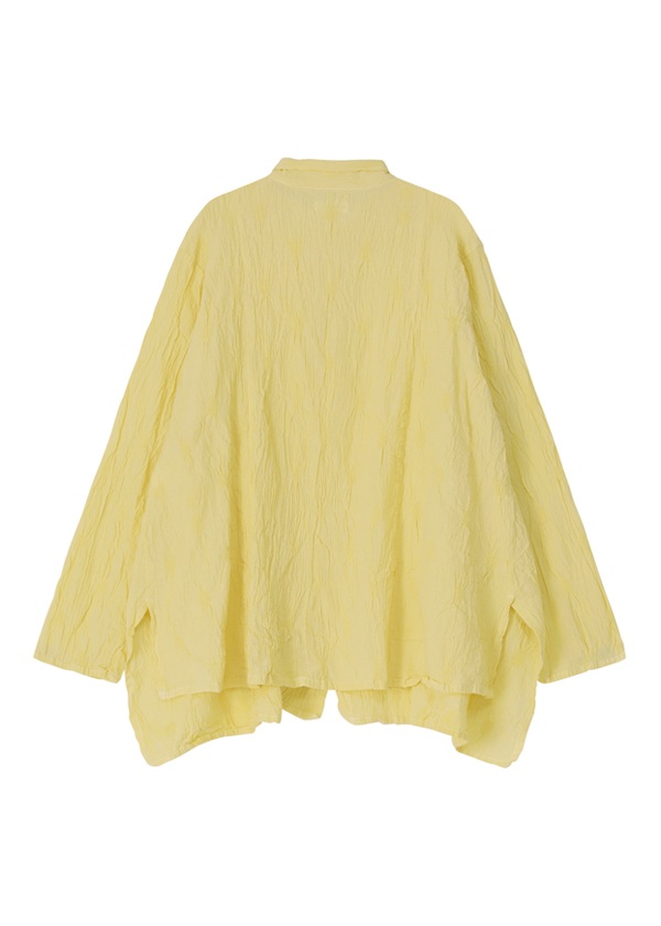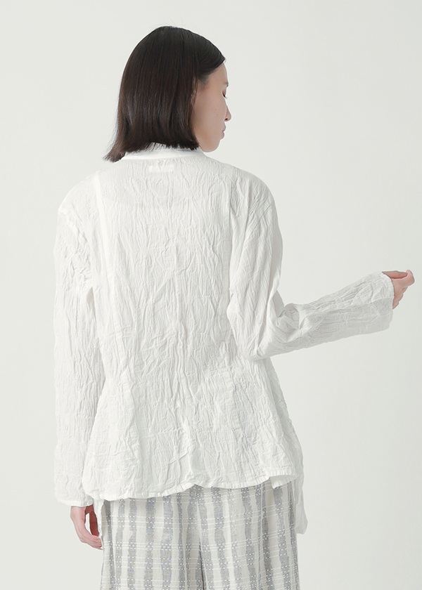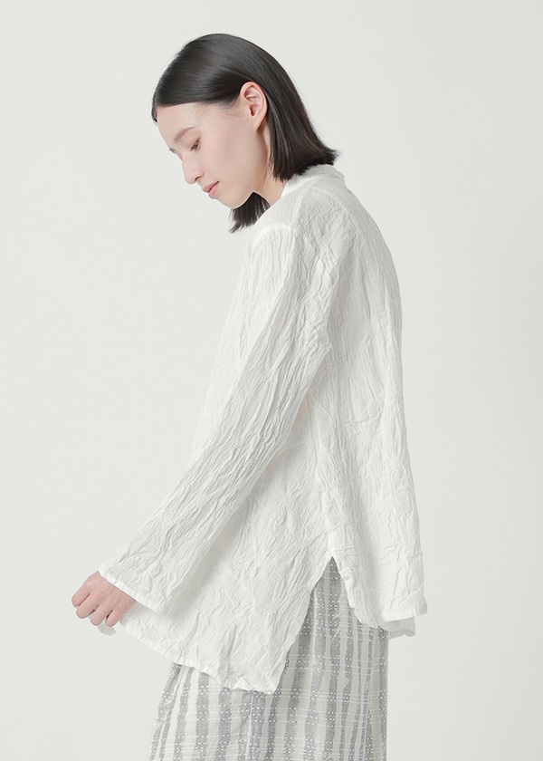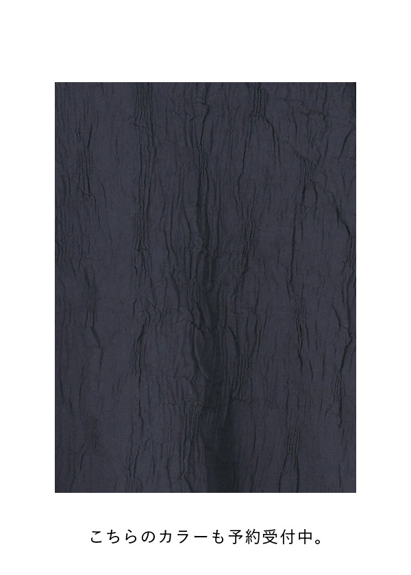 ヨコ糸の一部に強撚糸を使用し、ところどころに二重組織のドット柄を配することで、クシャっとした立体的なテクスチャーを表現した素材です。リズミカルな凹凸と、ドライでシャリ感のある肌触りが特徴の、コットン100%素材です。