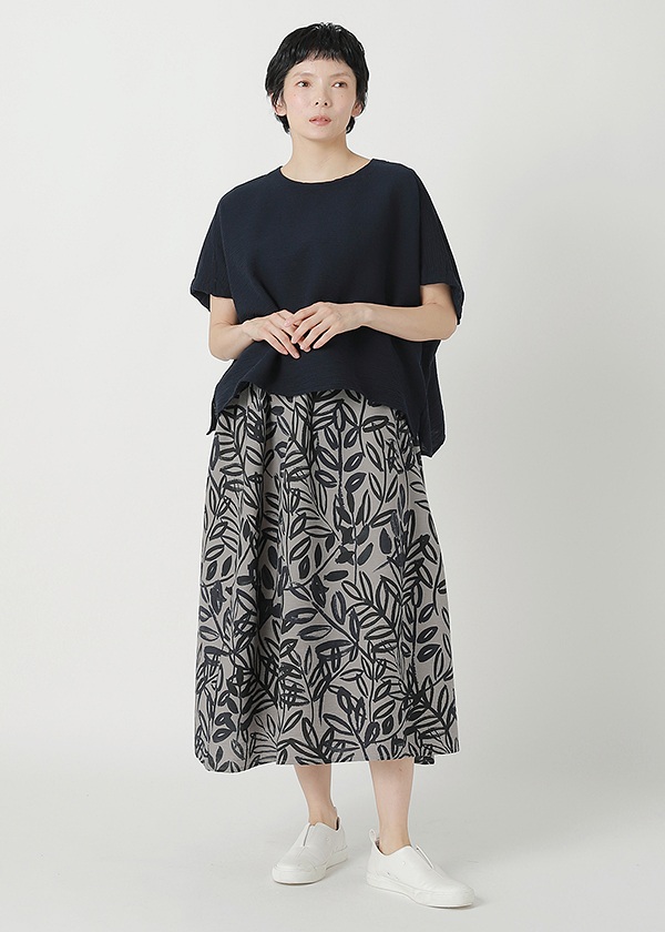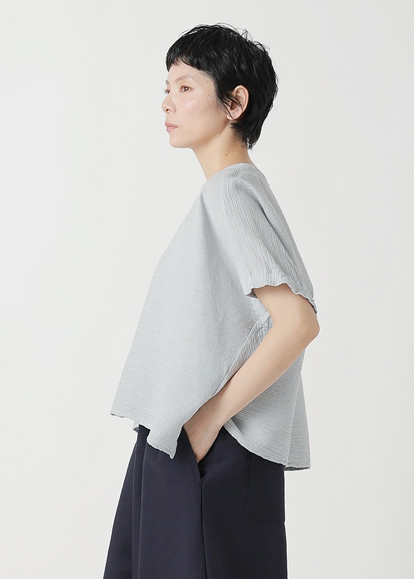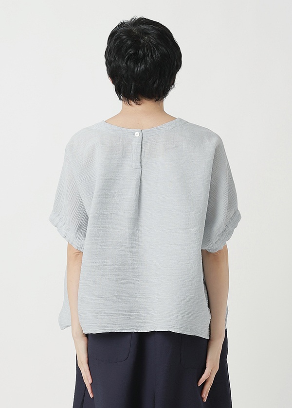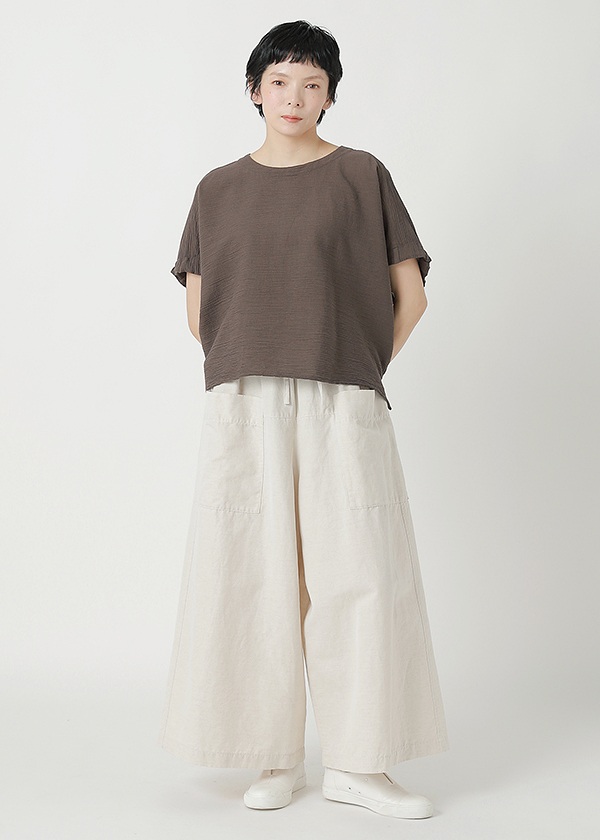 タテ糸に綿糸、ヨコ糸に撚りをかけた綿糸とペーパーヤーンを交互に打ち込んで織り上げた楊柳素材です。プランテーション定番のYOORYUUシリーズと同じように楊柳をボーダー状に使用しています。紙独特の軽量感とドライ感が特長の素材で、汗ばむ時期も快適に過ごしていただけます。定番のYOORYUUやYOORYUU Tとミックスコーディネートをすると、素材感の違いでニュアンスが生まれるので、統一感がありながら素材の変化も楽しめます。